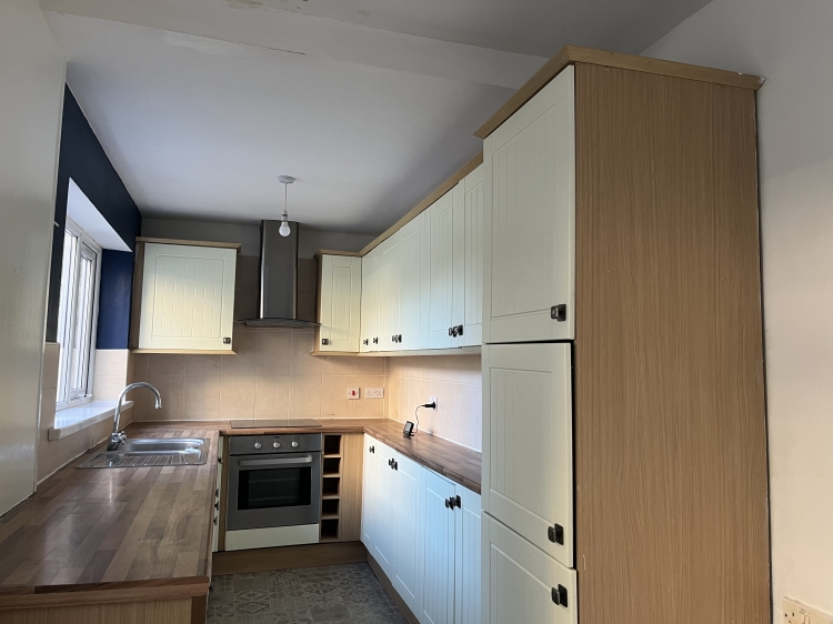 6.0706m x 2.1082m - 19'11" x 6'11"<br>Cream wall and base units with work surfaces, electric ceramic hob, electric oven, extractor hood, stainless steel sink unit with mixer tap, 2x UPVC windows, radiator, White UPVC half glass rear door leading to yard area