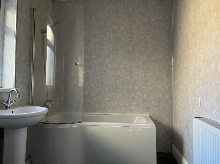 White curved bath with shower fitment and shower screen, white wash basin with mixer tap, low level white W/C, white UPVC frosted window, radiator, combi boiler