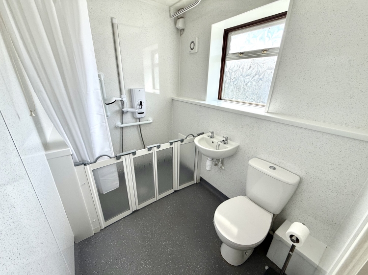 Comprising a shower area with Moira shower, wash hand basin and WC. Frosted window to the rear, extractor fan, textured ceiling and state of the art panel walls.