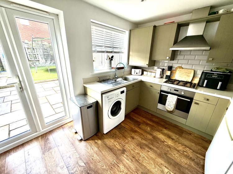 Fitted with a modern range of wall and base units having contrasting work surfaces, incorporating a stainless steel sink unit with spray mixer tap. Double glazed window to the rear, UPVC French doors, built in oven, four ring gas hob, stainless steel extractor hood, splashback tiling, laminate flooring and double central heating radiator.