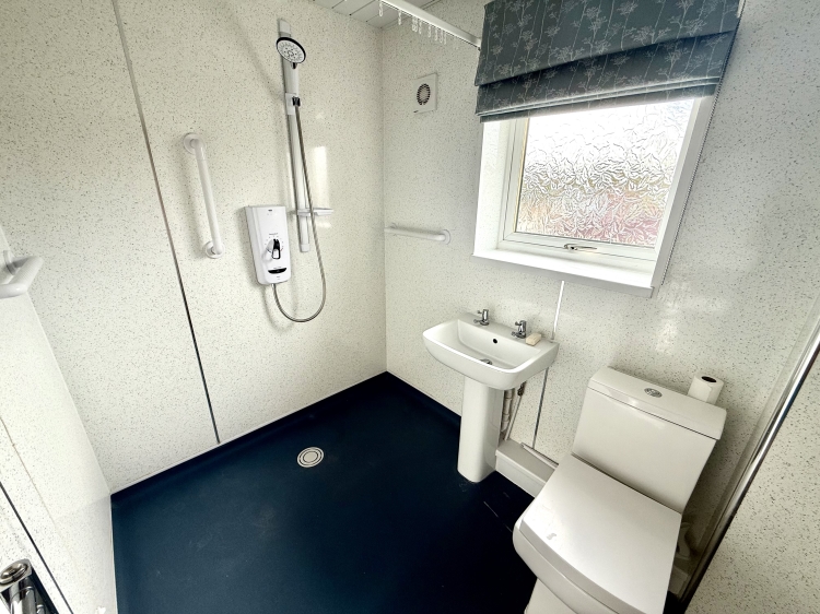 Mira shower, wash hand basin, wc, state of the art panel walls and ceiling, extractor fan, double glazed frosted window to the rear and chrome heated towel rail.