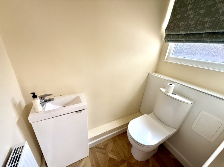 Fitted with a white two piece suite comprising a low level WC and wash hand basin. Double glazed frosted window to the side and central heating radiator.