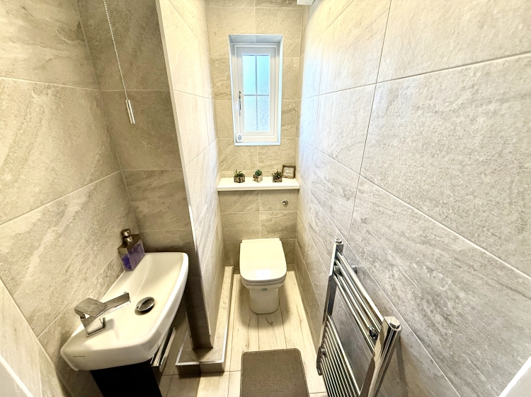 Recently refitted with a smart white two piece site comprising a vanity wash hand basin and WC. LVT flooring, double glazed UPVC frosted leaded window to the front, chrome heated towel rail and beautiful fully tiled walls.