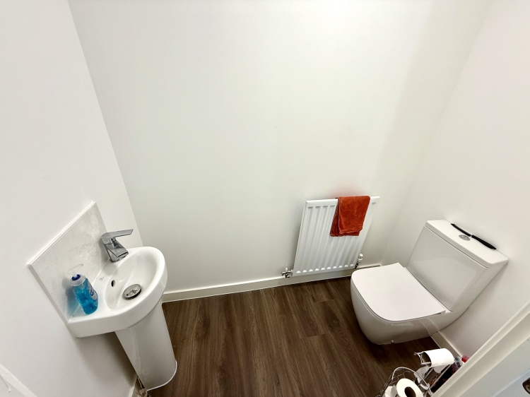 Fitted with a white two piece suite comprising a WC and wash hand basin. Splashback tiling, Karndean flooring and central heating radiator.