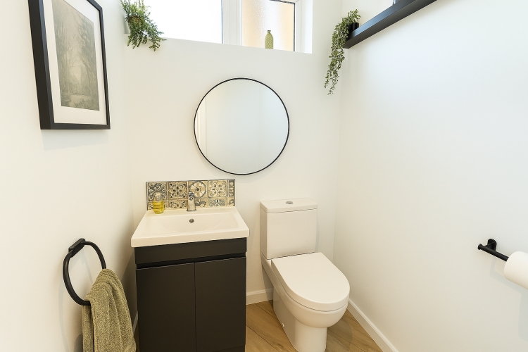 Fitted with a first class two piece suite comprising a vanity wash hand basin and low level WC. Herringbone style flooring, double glazed UPVC frosted window to the side, bespoke central heating radiator and mosaic splashback tiling.