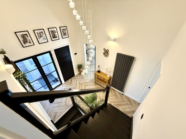 Herringbone style flooring, bespoke central heating radiator, glass and oak staircase to the first floor and split level stairs leading to the lounge.