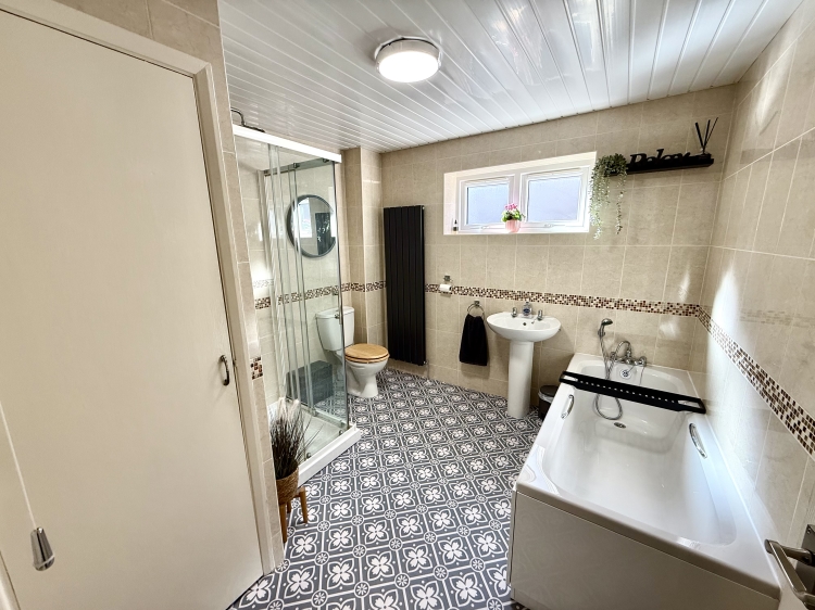 2.794m x 2.794m - 9'2" x 9'2"<br>Fitted with a four piece suite comprising a panel bath with mixer tap, pedestal wash hand basin, WC and separate shower cubicle. Useful storage cupboard, grey bespoke central heating radiator, fully tiled walls and double glazed UPVC frosted window to the side.