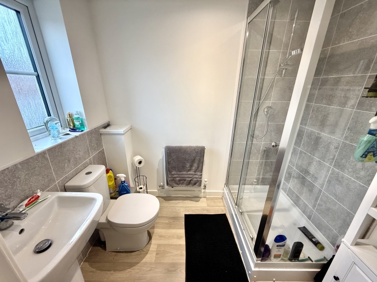 Fitted with a white three piece suite comprising a double walk in shower cubicle, pedestal wash hand basin and low level WC. Central heating radiator, double glazed UPVC frosted window to the front and extractor fan.