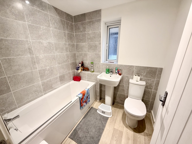 Fitted with a white three piece suite comprising a panel bath with shower over, pedestal wash hand basin and low level WC. Double glazed UPVC frosted window to the side, extractor fan, downlighters and single central heating radiator.