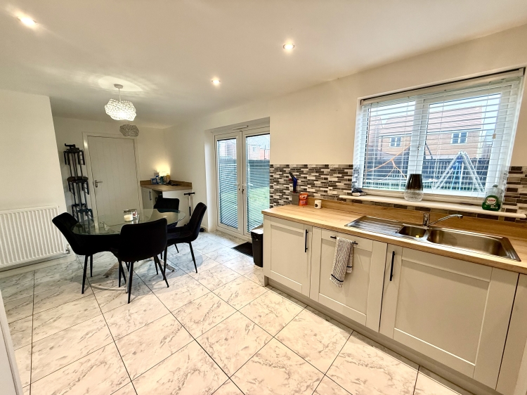 6.604m x 3.2258m - 21'8" x 10'7"<br>Fitted with a modern range of the 'shaker' wall and base units, having contrasting work surfaces, incorporating a stainless steel sink unit with mixer tap and drainer. Double glazed UPVC French doors to the rear, double glazed window, downlighters, built in oven, four ring gas hob and extractor hood, integrated fridge and freezer, attractive splashback tiling and double central heating radiator.