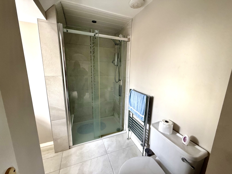 Refitted with a luxury three piece suite comprising a WC, double walk in shower cubicle and vanity wash hand basin. Double glazed frosted leaded window to the front, tiled flooring and chrome heated towel rail.