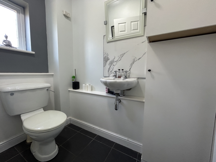 Tiled flooring, wc, hand basin and built in cupboard housing modern gas COMBI boiler.