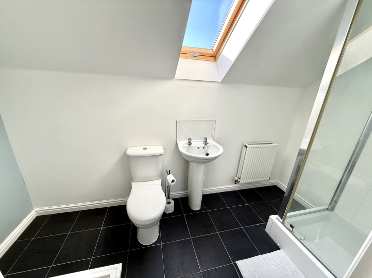 Fitted with a three piece suite comprising a walk in shower cubicle, pedestal wash hand basin and wc. Velux window to the rear, double central heating radiator and tiled flooring.