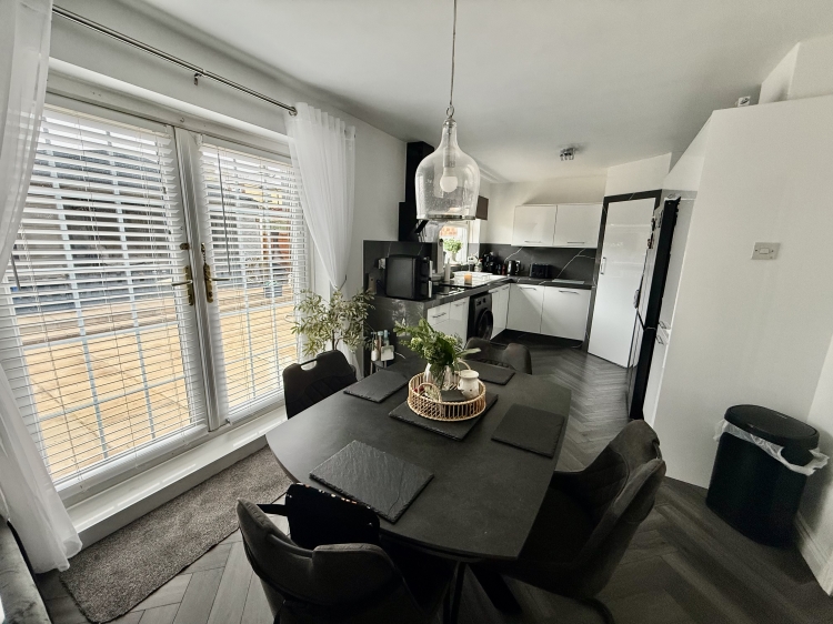 5.9436m x 3.0988m - 19'6" x 10'2"<br>Fitted with a quality range of the high gloss wall and base units, having granite working surfaces with matching splashback. Double glazed window to the rear, double glazed UPVC French doors, single central heating radiator, laminate flooring, induction hob, state of the art extractor fan and built in oven.