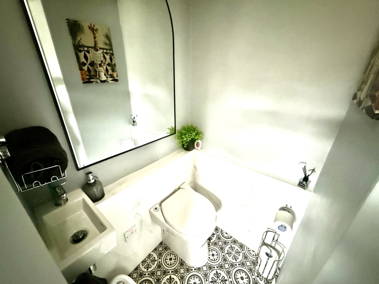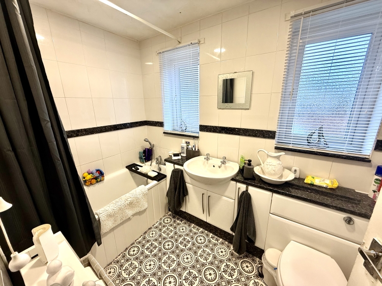 Fitted with a white three piece suite, with chrome effect fitments, comprising a panel bath with mixer tap shower over an Triton shower over, vanity wash hand basin and WC. Two double glazed UPVC frosted windows to the rear, heated towel rail, beautiful fully tiled walls and textured ceiling.
