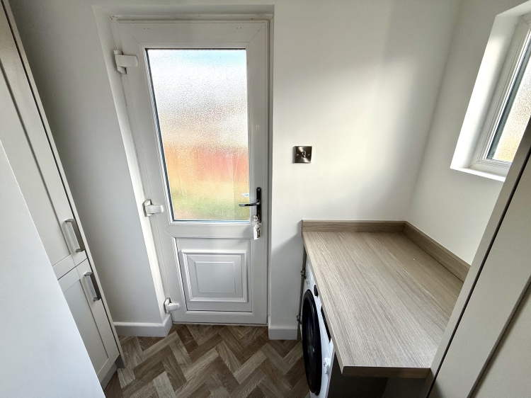 Integrated fridge and freezer, integrated washing machine, larder cupboard, double glazed UPVC frosted window to the side and UPVC external door.