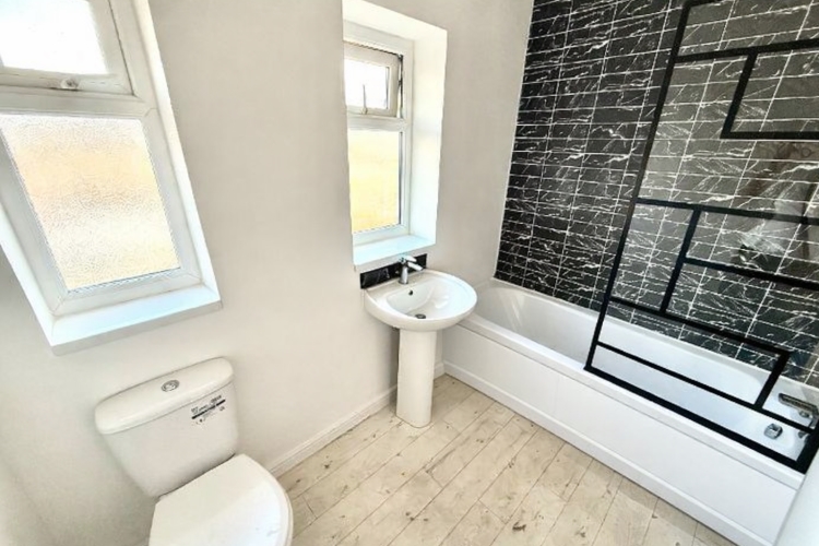 2.4638m x 1.651m - 8'1" x 5'5"<br>Fitted with a white three piece suite comprising a panel bath with shower screen and shower over, wash hand basin and WC. Two double glazed frosted window to the rear, extractor fan, modern splashback tiling, extractor fan, heated towel rail and downlighters.
