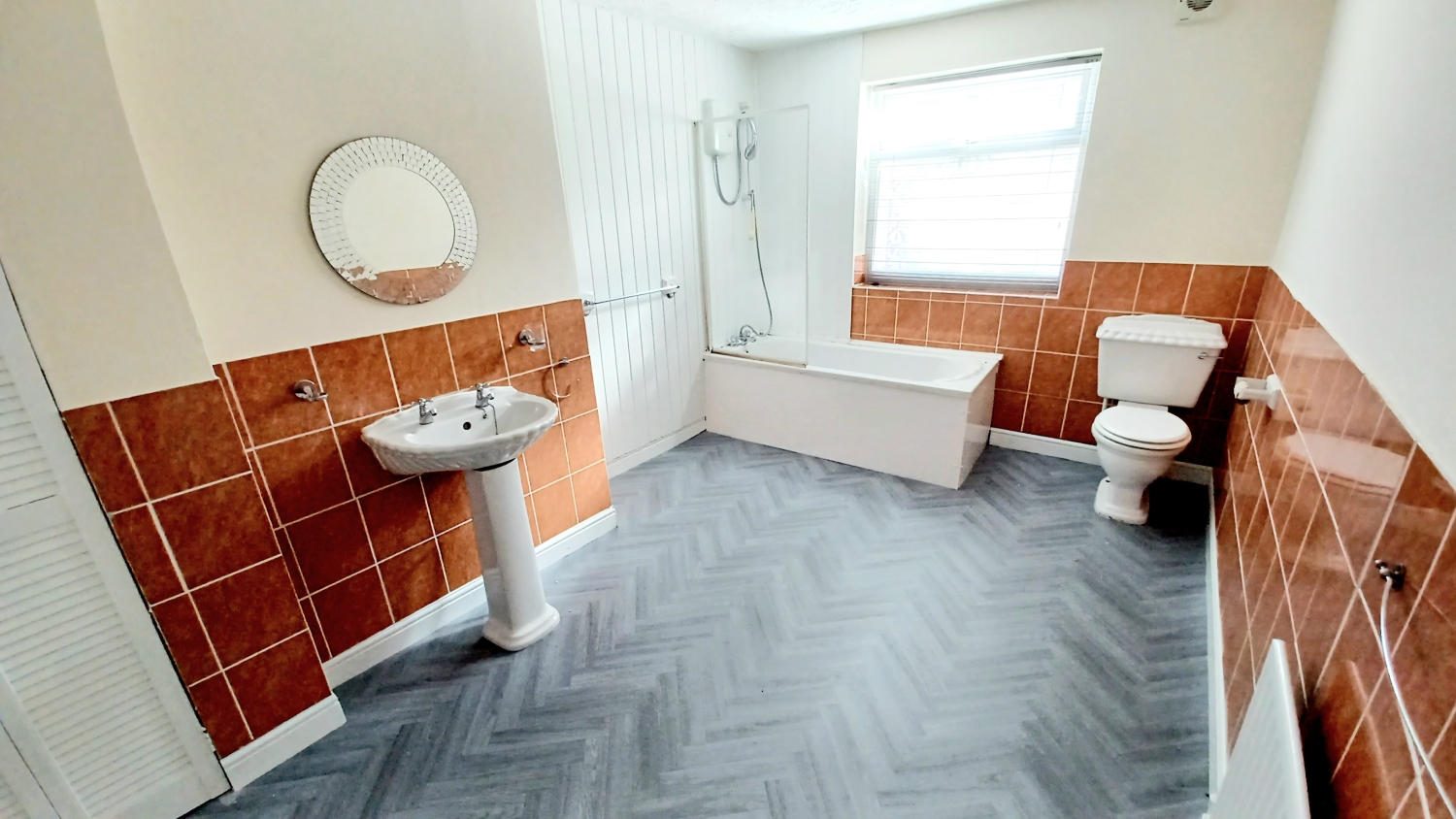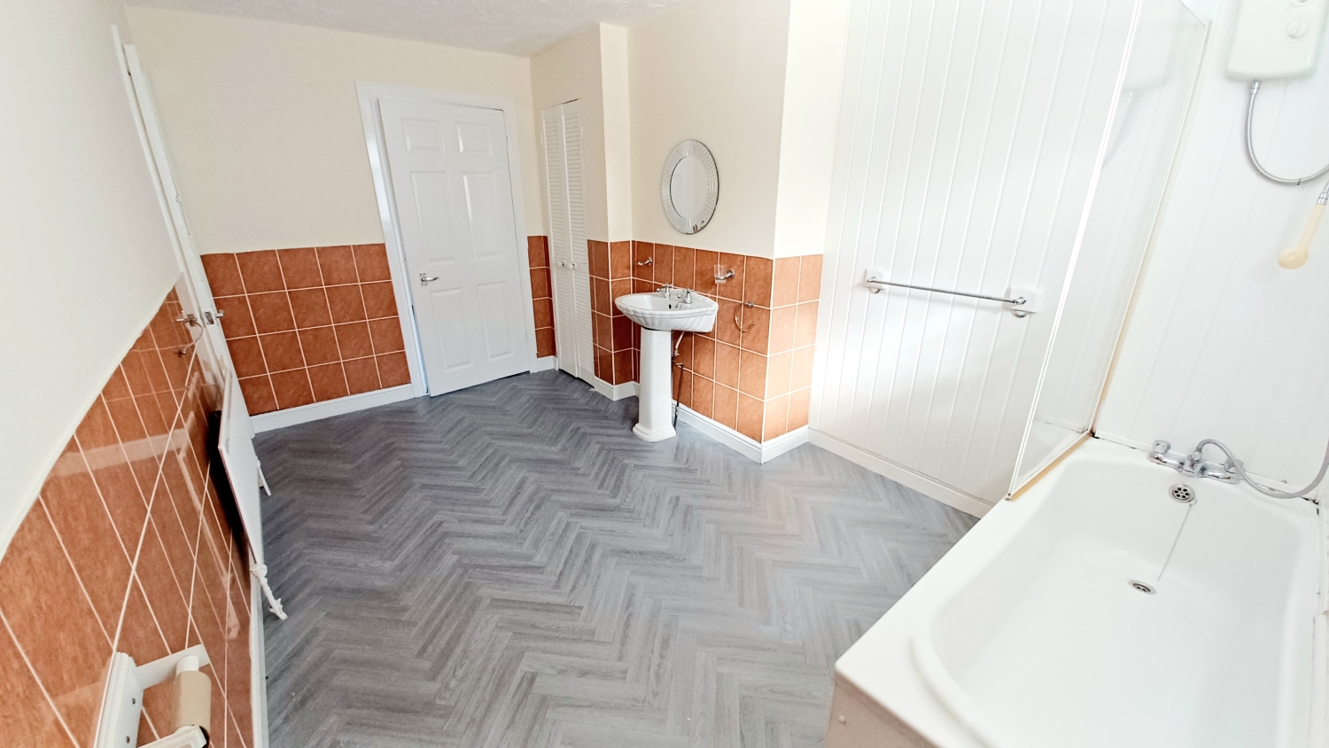 Fitted with a 3 white piece suite comprising panelled bath, pedestal wash hand basin, low level WC, tiled to 1/2 height, opaque UPVC window and single central heating radiator.