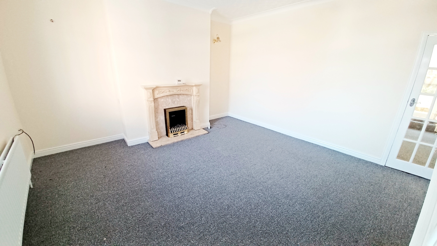With a UPVC entrance door, UPVC window to the front, double central heating radiator, marble effect fireplace with living flame gas fire, coving to ceiling and staircase leading to the first floor accommodation.