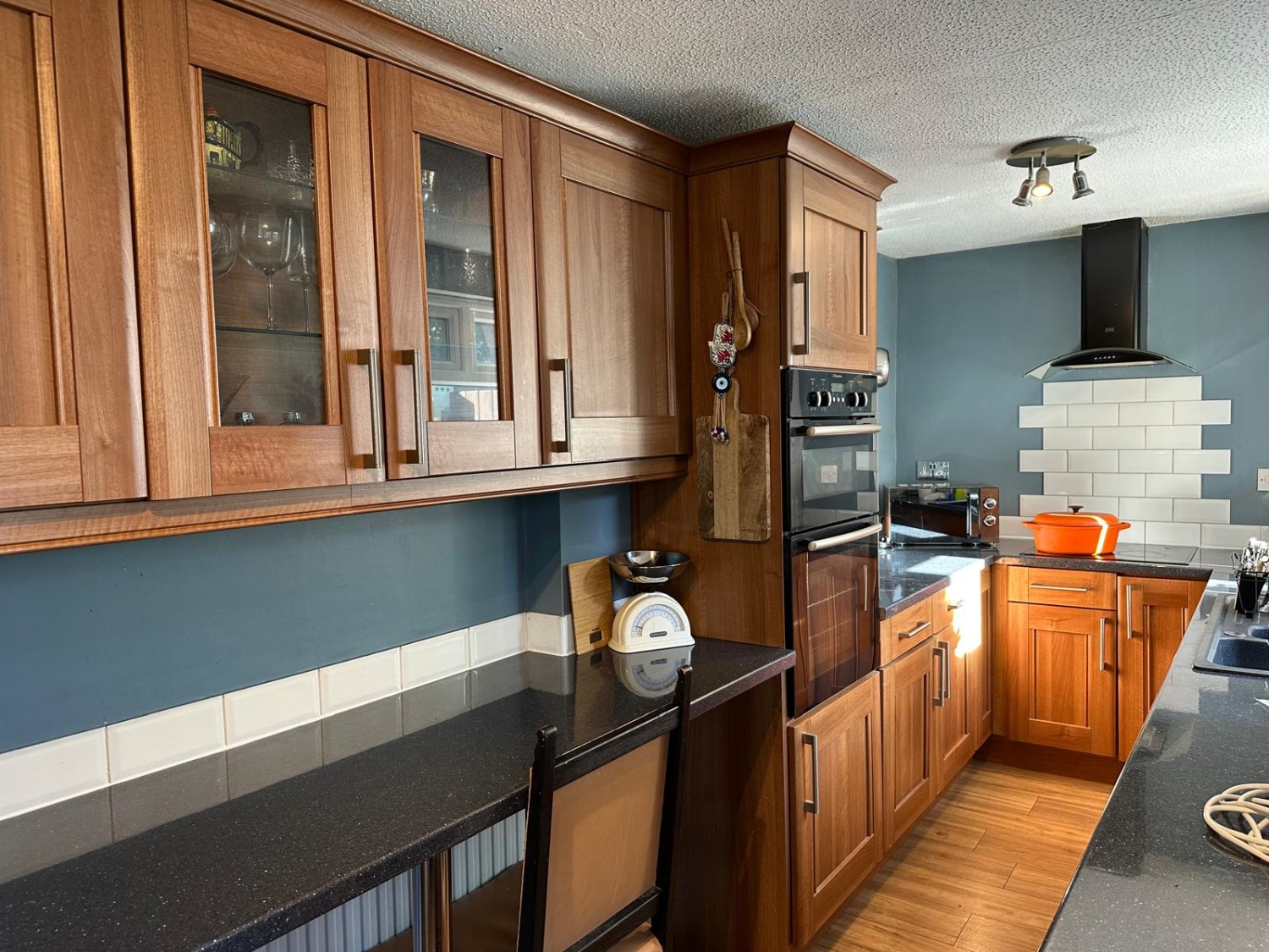 Fitted with an excellent range of modern base and wall units finished in a medium oak, heat resistant worktops, sink unit with mixer tap, integrated oven with hob and chimney extractor hood, space for fridge freezer and integrated dishwasher, plumbing for automatic washing machine, upvc framed double glazed window, radiator, wood flooring, tiling to splashbacks, additional double glazed window, door accessing the rear of the property.