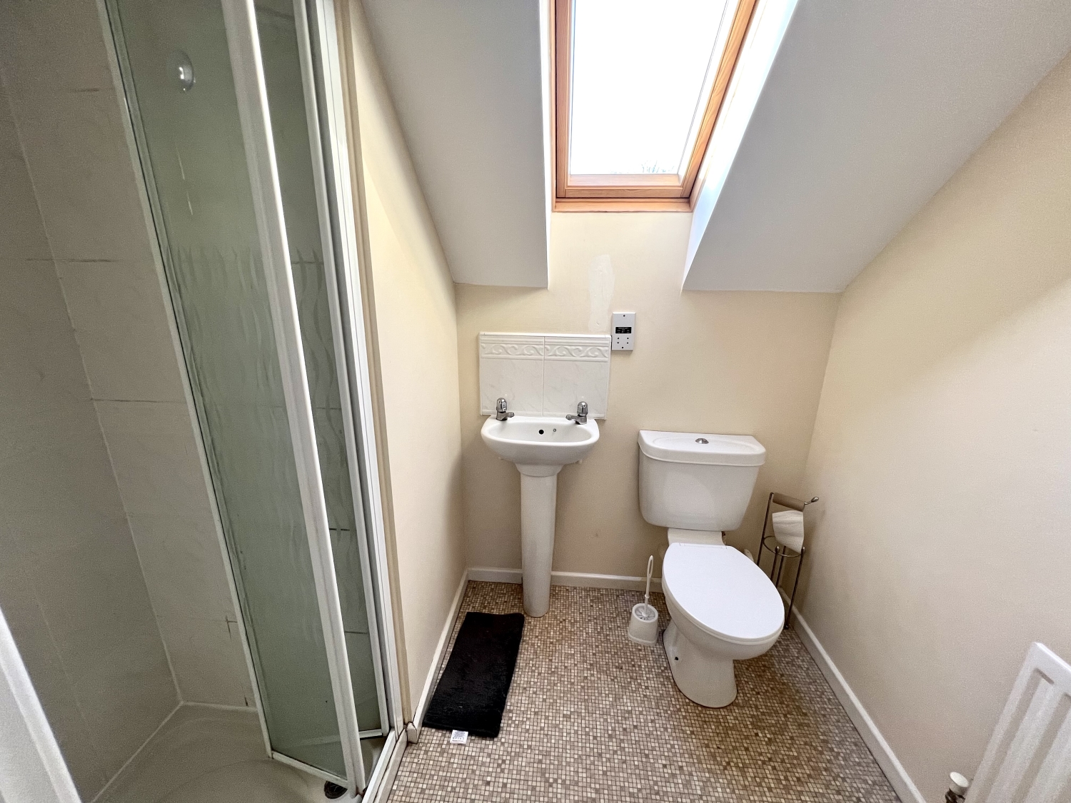 Has fully tiled shower cubicle with mains fed shower, WC, vanity hand wash basin, double glazed velux window, radiator, shaver socket.
