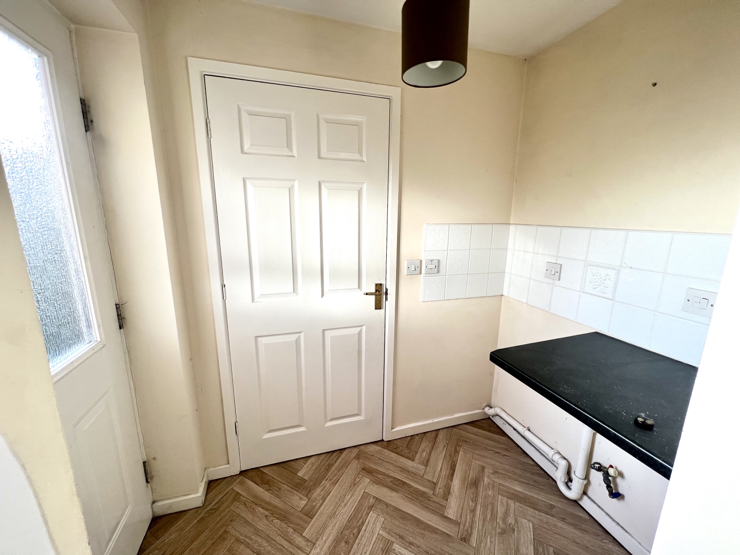 Plumbing for an automatic washing machine, door with double glazed panel leading to outside, part tiling to walls, door to: