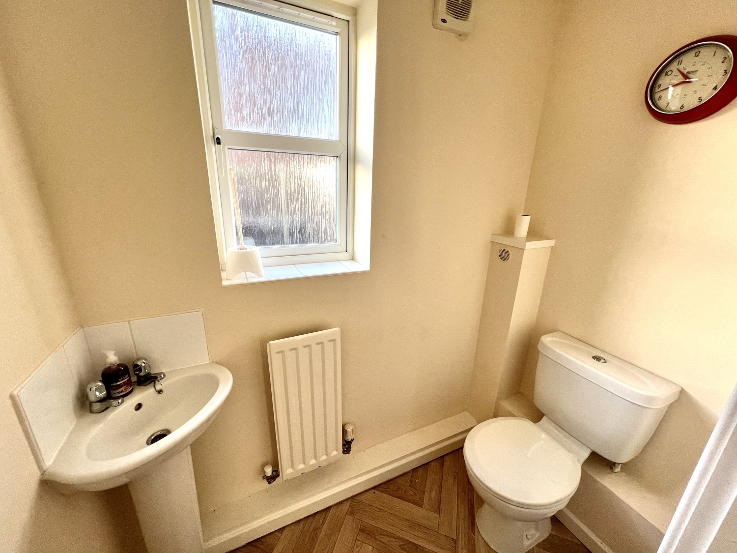 Comprising WC, corner vanity hand wash basin, extractor fan, Upvc framed double glazed window.