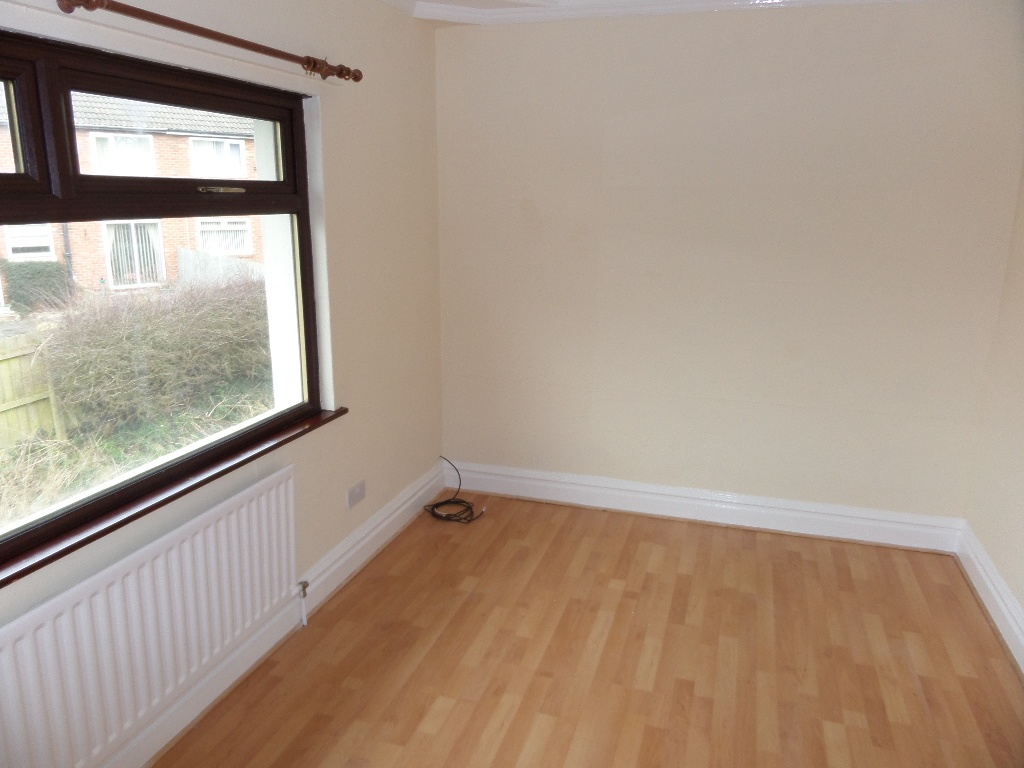 Two Upvc framed double glazed windows, radiator, picture rail, original fireplace painted white, laminate wood flooring, storage cupboard.