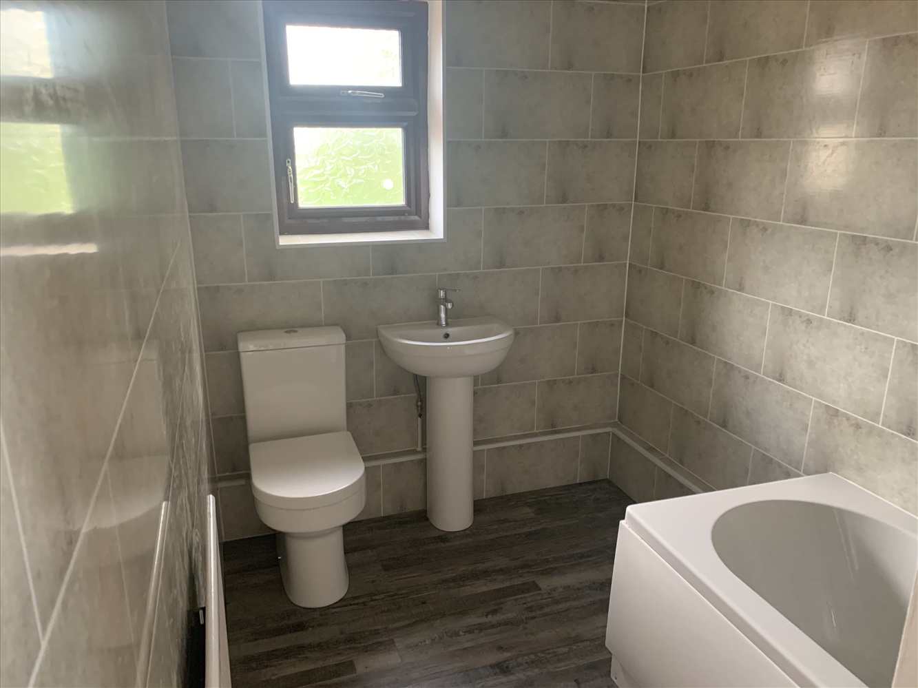Fitted with a white suite comprising of panel bath with wood side and end panel, hand wash basin, WC, over bath electric shower, glass partition, glazed tiling to splash areas, Upvc framed double glazed window, radiator, storage cupboard