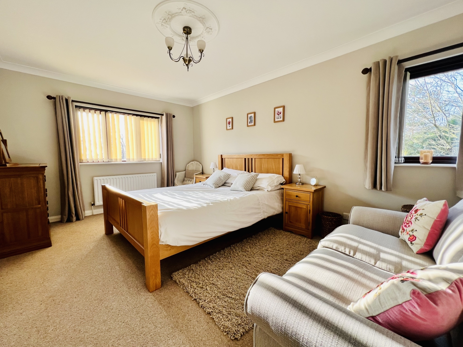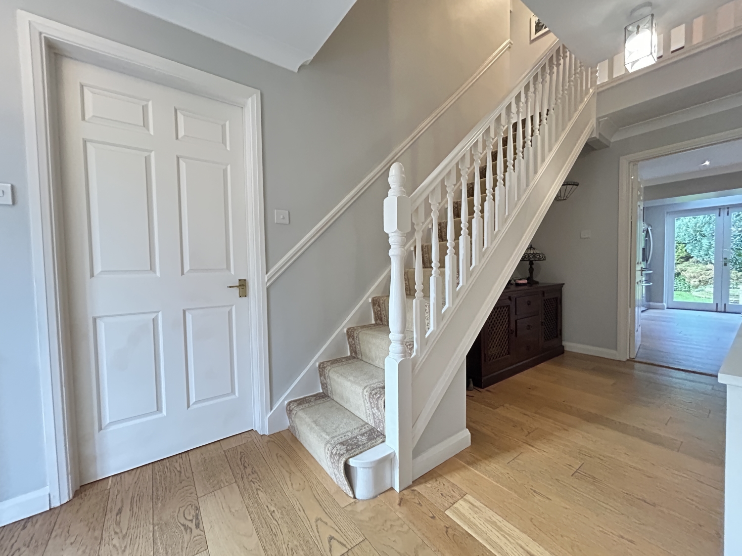 Spacious landing with loft access, storage cupboard which has sliding doors to access a walk in store cupboard which houses the hot water cistern. Solid Oak flooring.