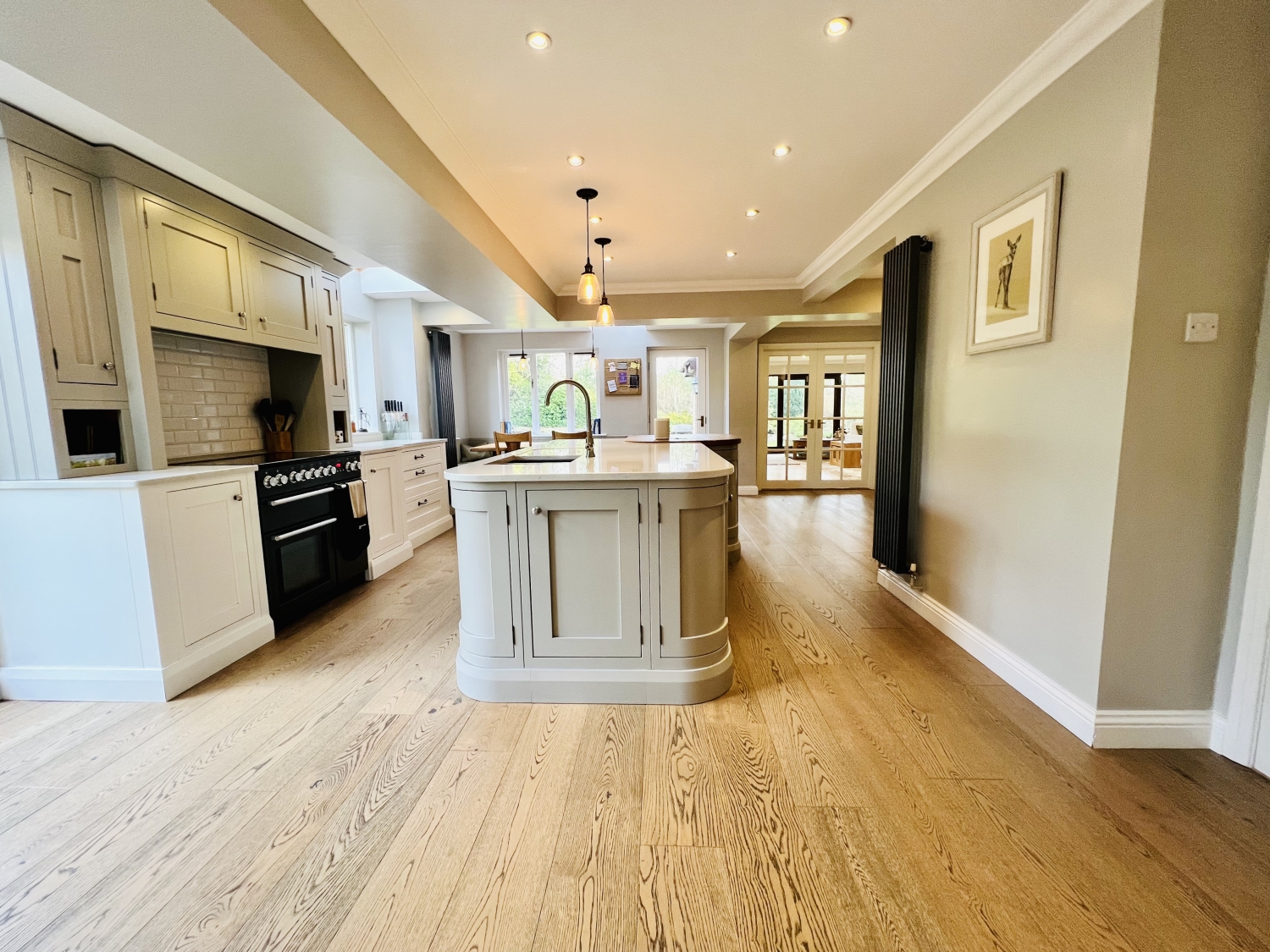 Partly housed in an extension. Fantastic range of high quality solid wood base and wall units with a two tone grey and white finish, quartz and solid wood work surfaces, the island incorporates a one and a half stainless steel sink unit, integrated dishwasher in the island, pop up power points. Separately in the kitchen area there is a pantry with bi-folding doors which gives provision for making tea, coffee etc, hot water tap, integrated fridge and microwave. Three double glazed windows, three double glazed Velux windows, breakfasting and dining space into the corner, French door accessing the rear garden, Georgian doors which access the garden room another set of French doors accessing the garden space, engineered Oak floor, retro style glazed tiling to the Inglenook housing the range cooker, extraction.