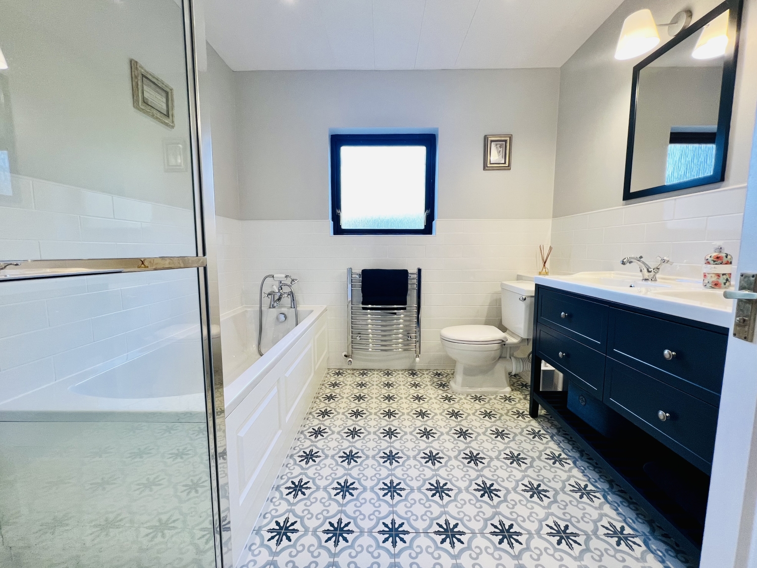 Fitted with a high quality recently reappointed four piece suit comprising of walk in shower enclosure with mains fed shower, panelled bath with shower attachment, low level w.c. his and hers handwash basin set into a deep blue vanity unit with storage and shelving, retro style glazed tilling to splash and vanity areas and likewise to the floor, chrome heated towel rail, extractor, inset spot lights to ceiling, double glazed window.