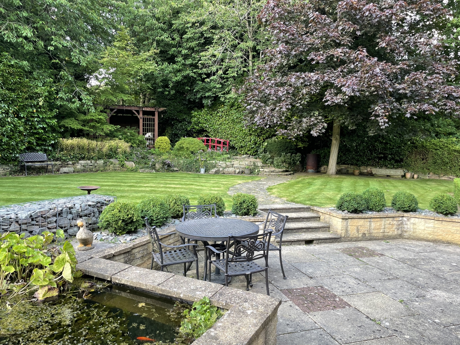 To the rear and the side there is an extensive fence, hedge and tree lined garden space which wraps round both sides of the property into the rear. It features large laned areas, planted with a wide variety of trees, flora and shrubs, ornamental pond, power, security lighting, water tap, pergola. Enjoys an excellent degree of privacy from neighbouring properties. It a mature style garden for the house type. Flagged patios and walkways that wraparound the property.
