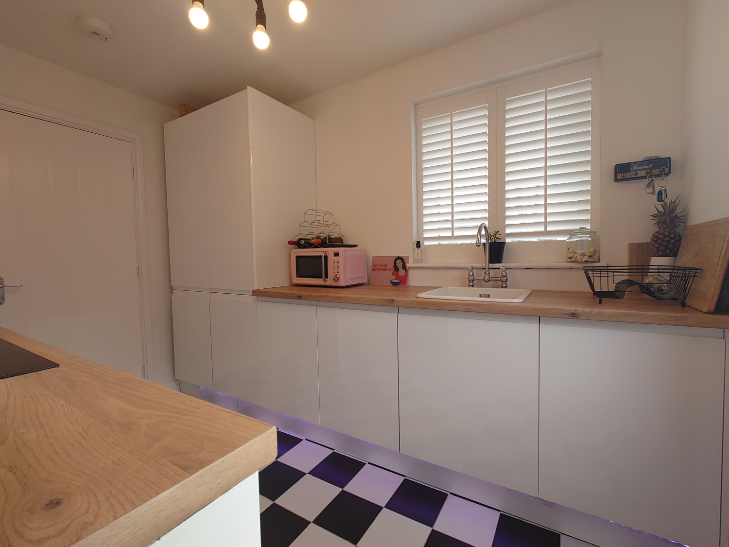 An attractive modern refitted kitchen with a range of striking 'Hi gloss' storage units with ample work top space, integrated oven and hob, space for appliances and window to front and glazed door to side giving a high level of natural light.