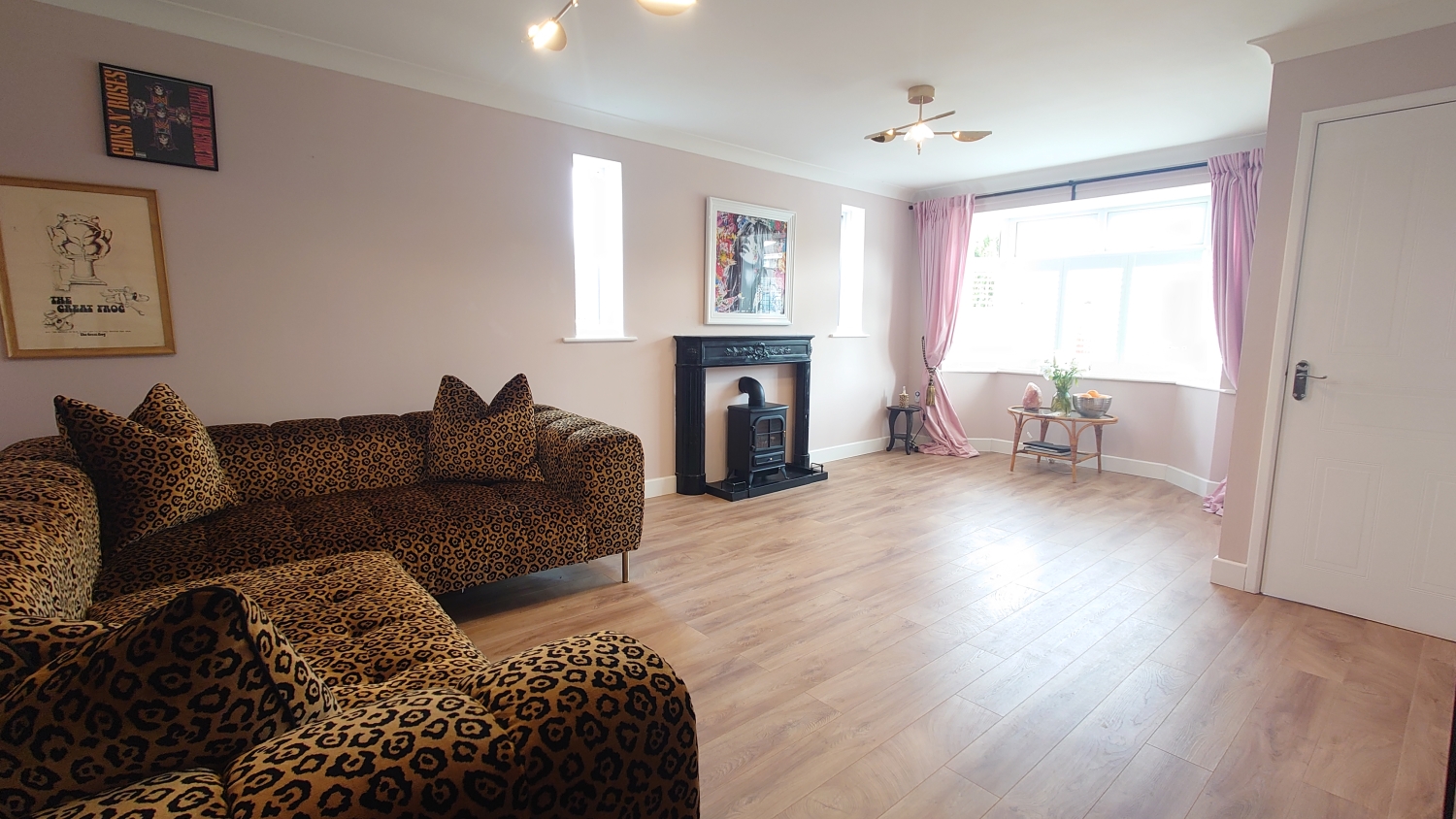 A spacious open plan lounge dining room with bay window to front, light wood effect flooring, and decorative fireplace.