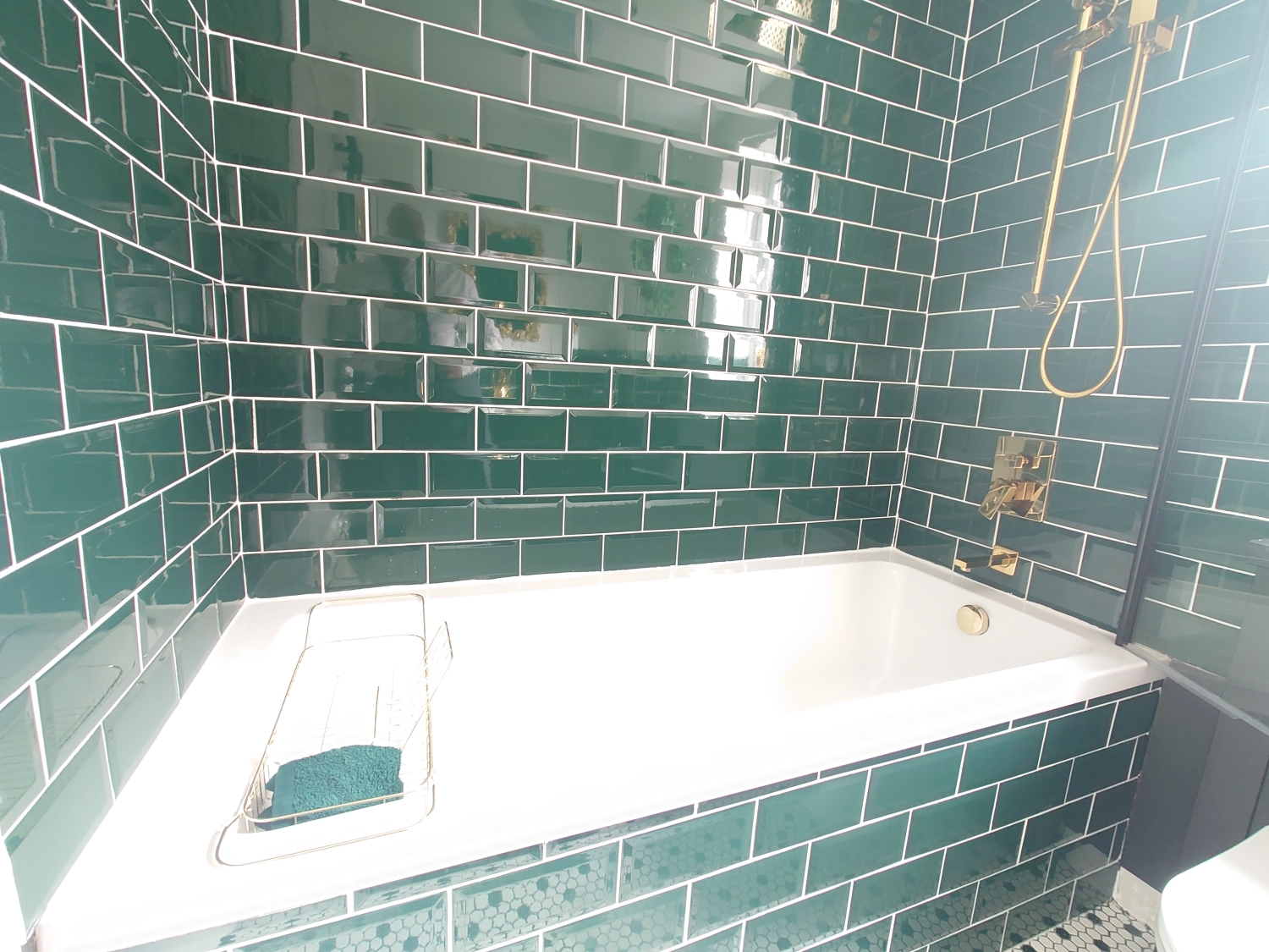 A stunning contemporary modern bathroom with recently refitted white suite with contrasting tiling, gold effect fittings, shower over bath, wc and vanity sink.