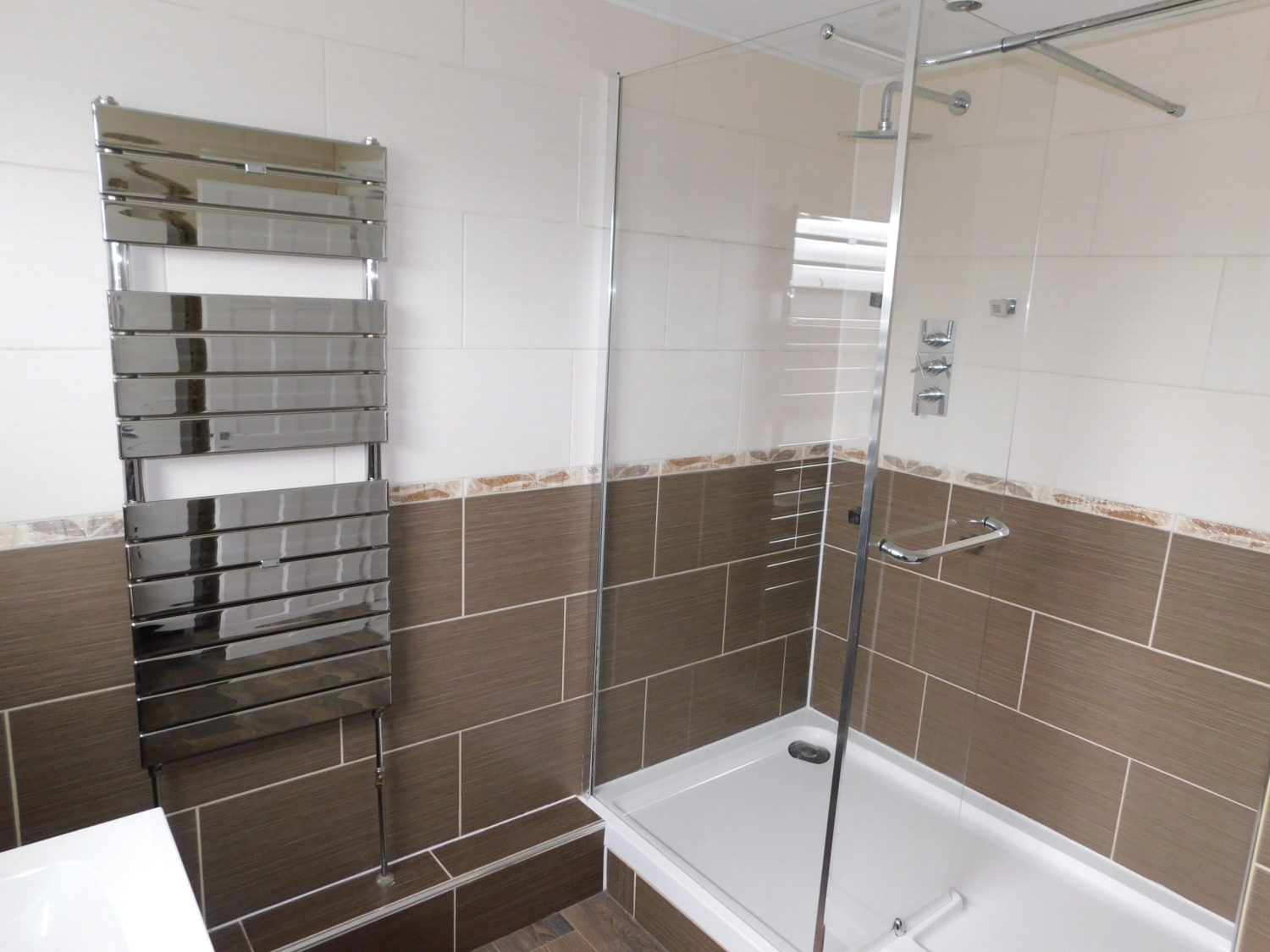 Having a modern white suite comprising of an L-shaped bath with shower over, low level wc, wash basin, tiling, recessed spot lighting, tiled flooring, heated towel rail, extractor fan and a double glazed window to the rear.