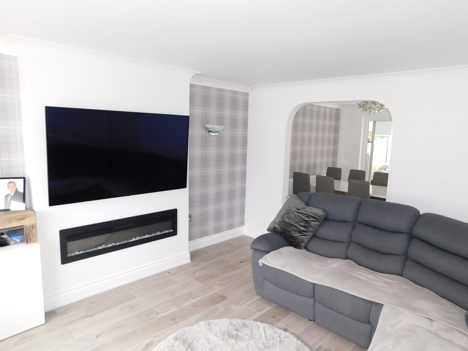 Having a double glazed window to the front, laminate flooring, a storage cupboard, T.V. point, coving, a radiator and open plan access to the dining room.