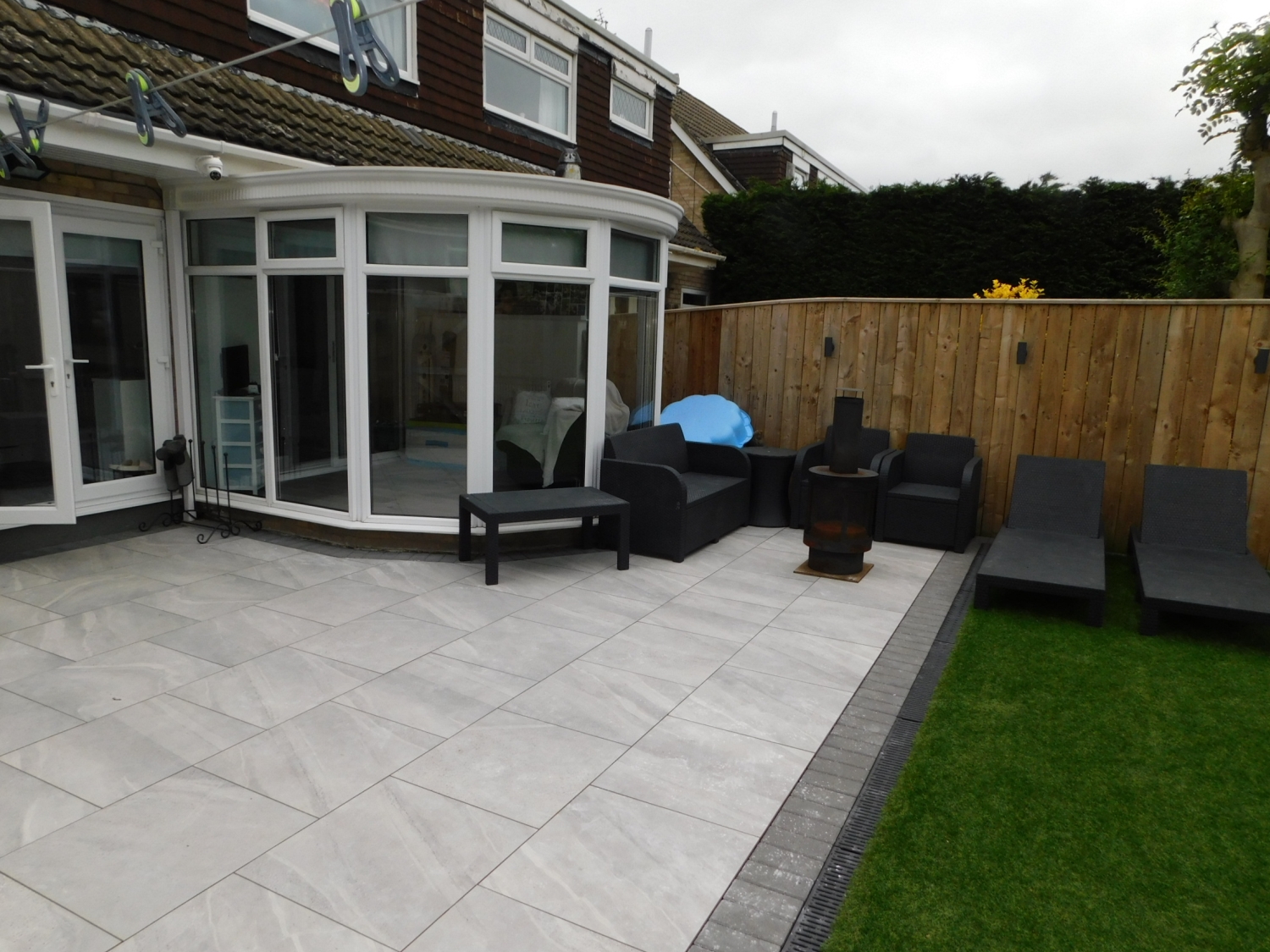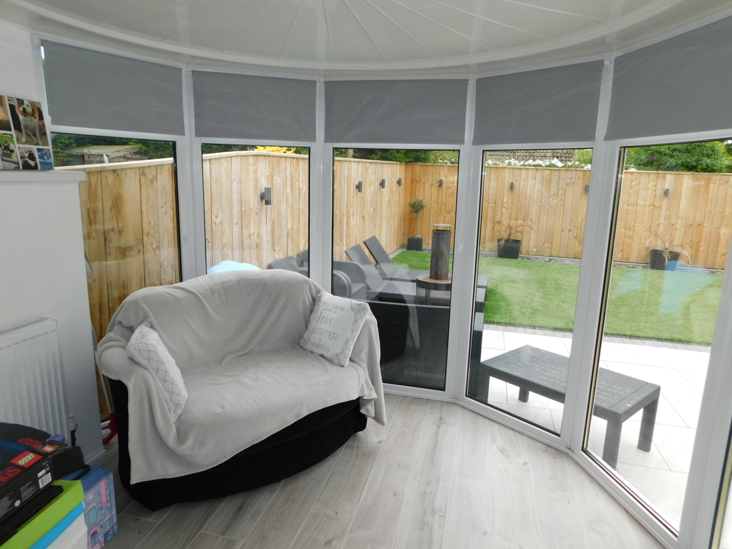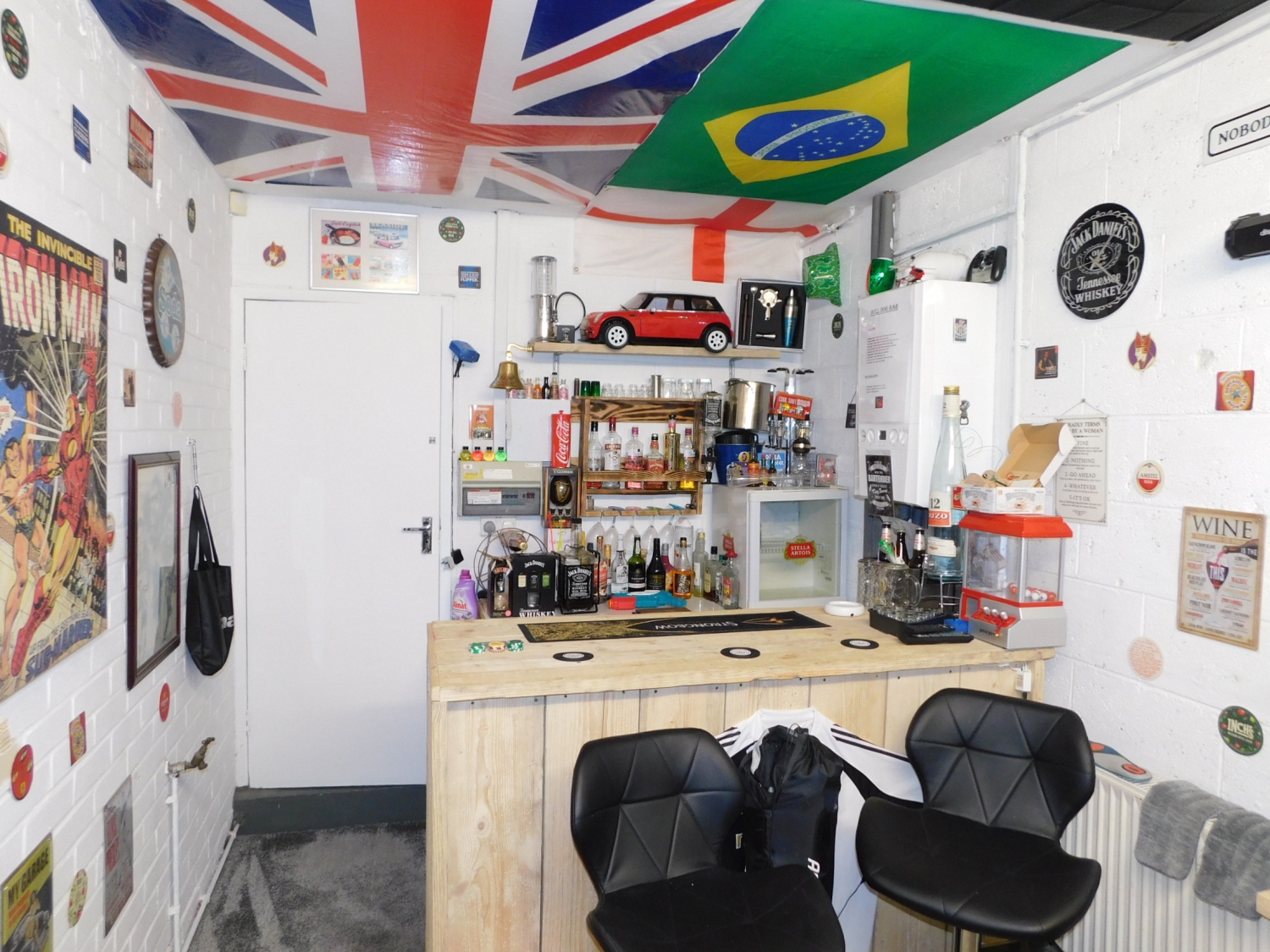 Created via a garage conversion. Having plumbing for a washing machine, space for a tumble dryer, a radiator, built-in seating and a bar.