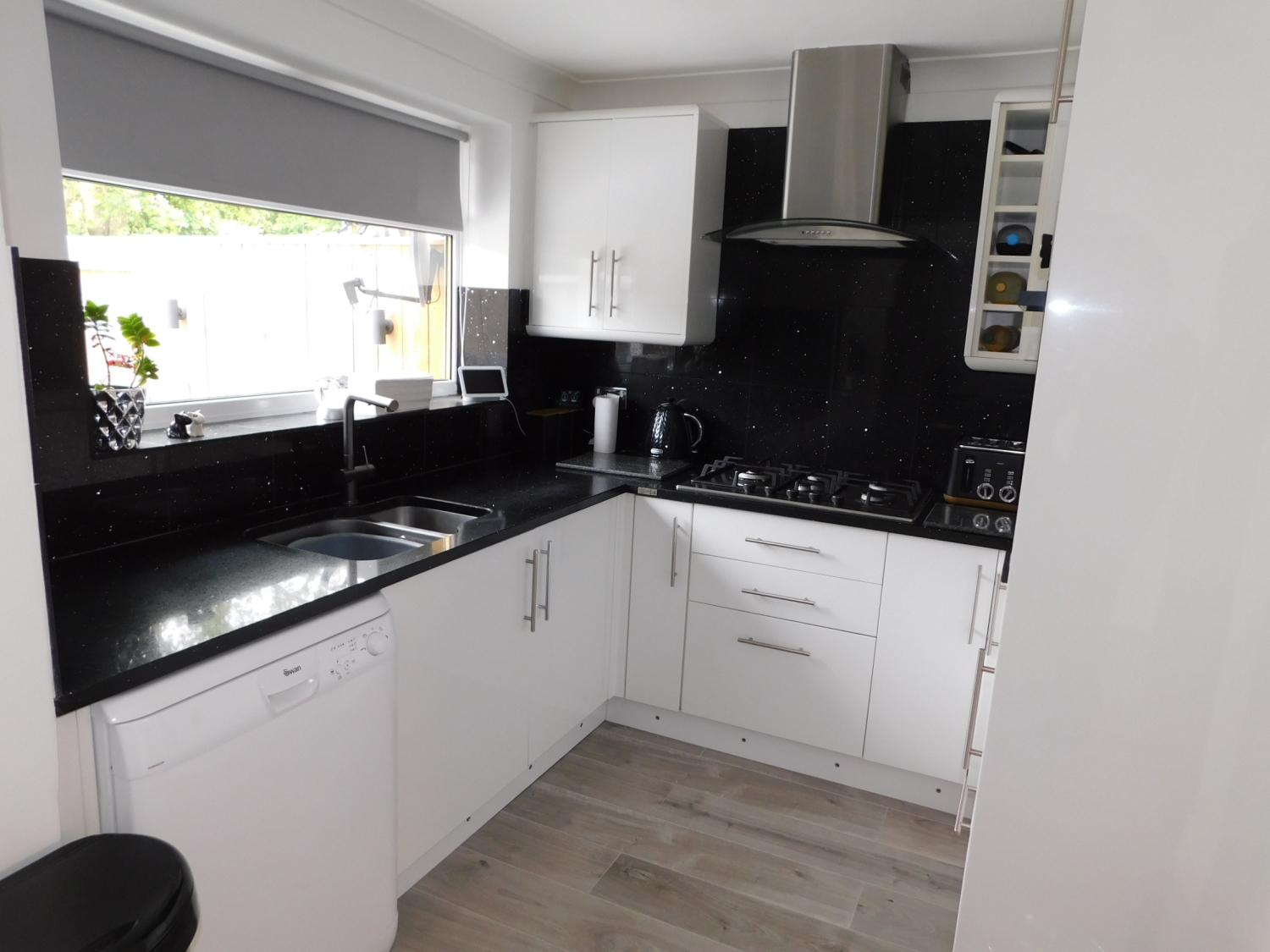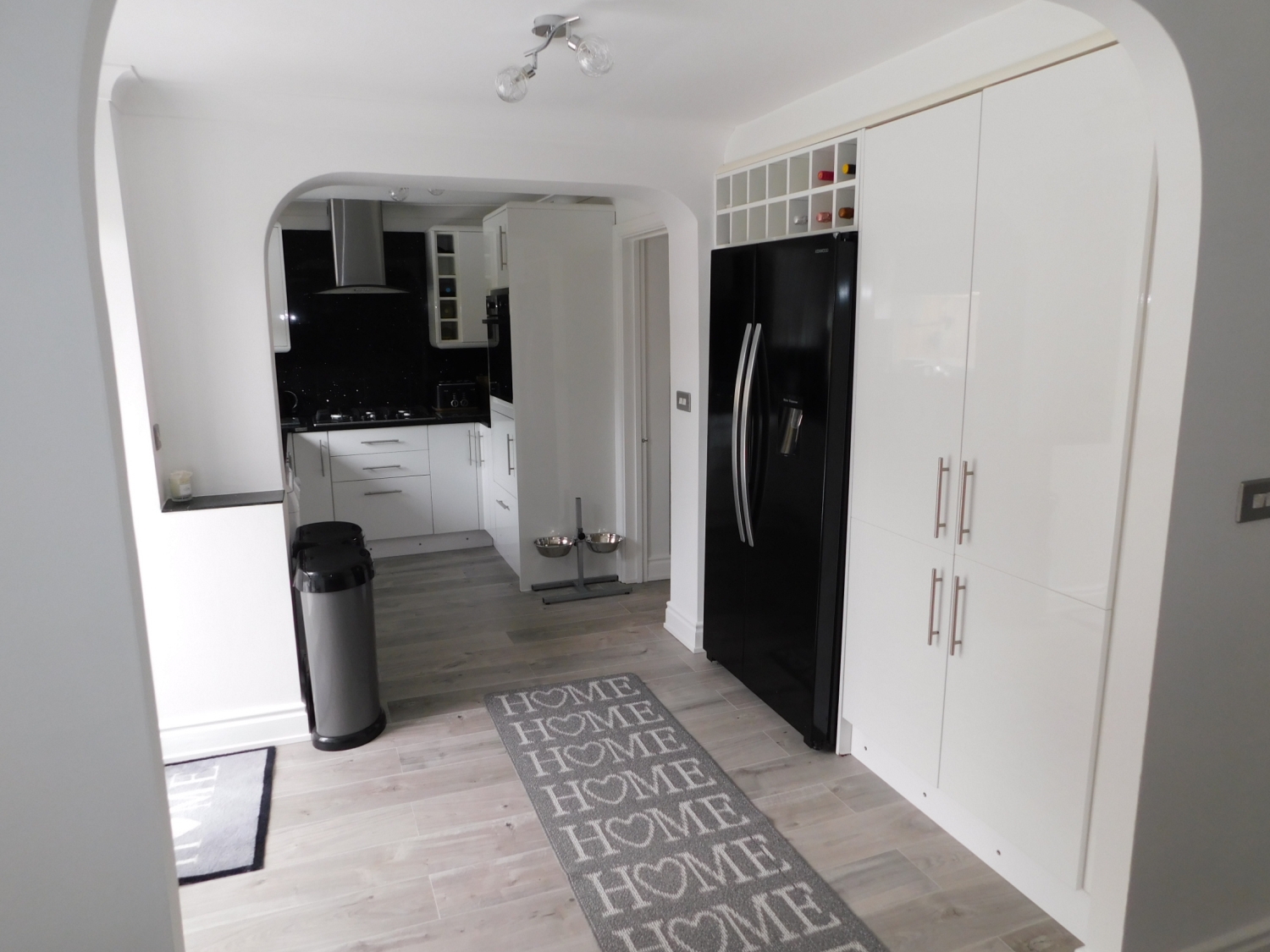 MEASUREMENTS TO MAXIMUM. A light and spacious kitchen which has a modern range of wall & base units with granite worksurfaces, one and a half bowl sink unit with mixer tap, gas hob with extractor hood, eye-level electric oven, space for an American style fridge freezer, wine rack, tiled splash backs, laminate flooring, a radiator, double glazed window to the rear and French Doors leading to the rear garden.