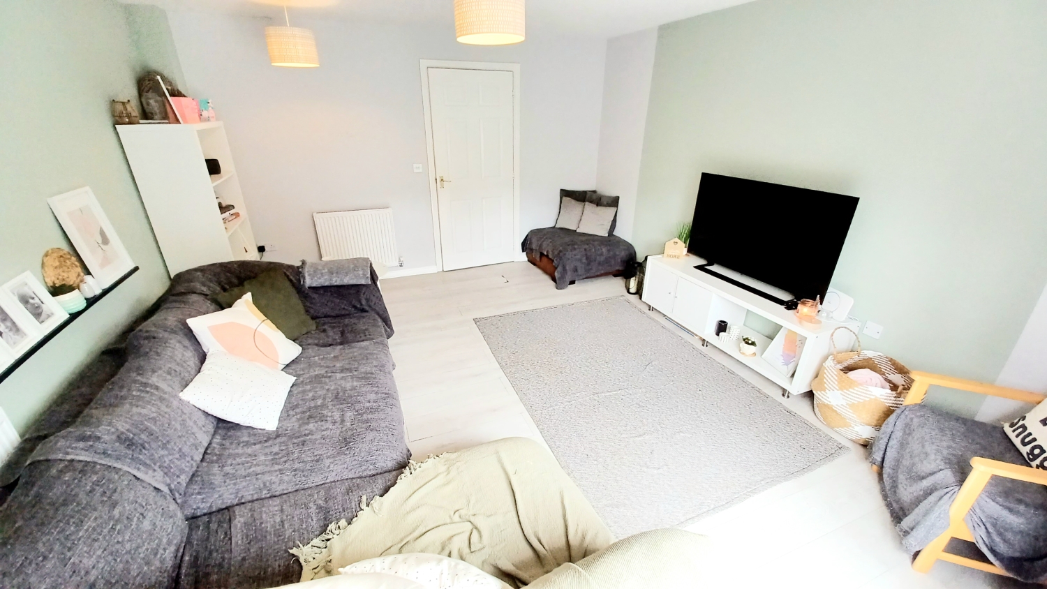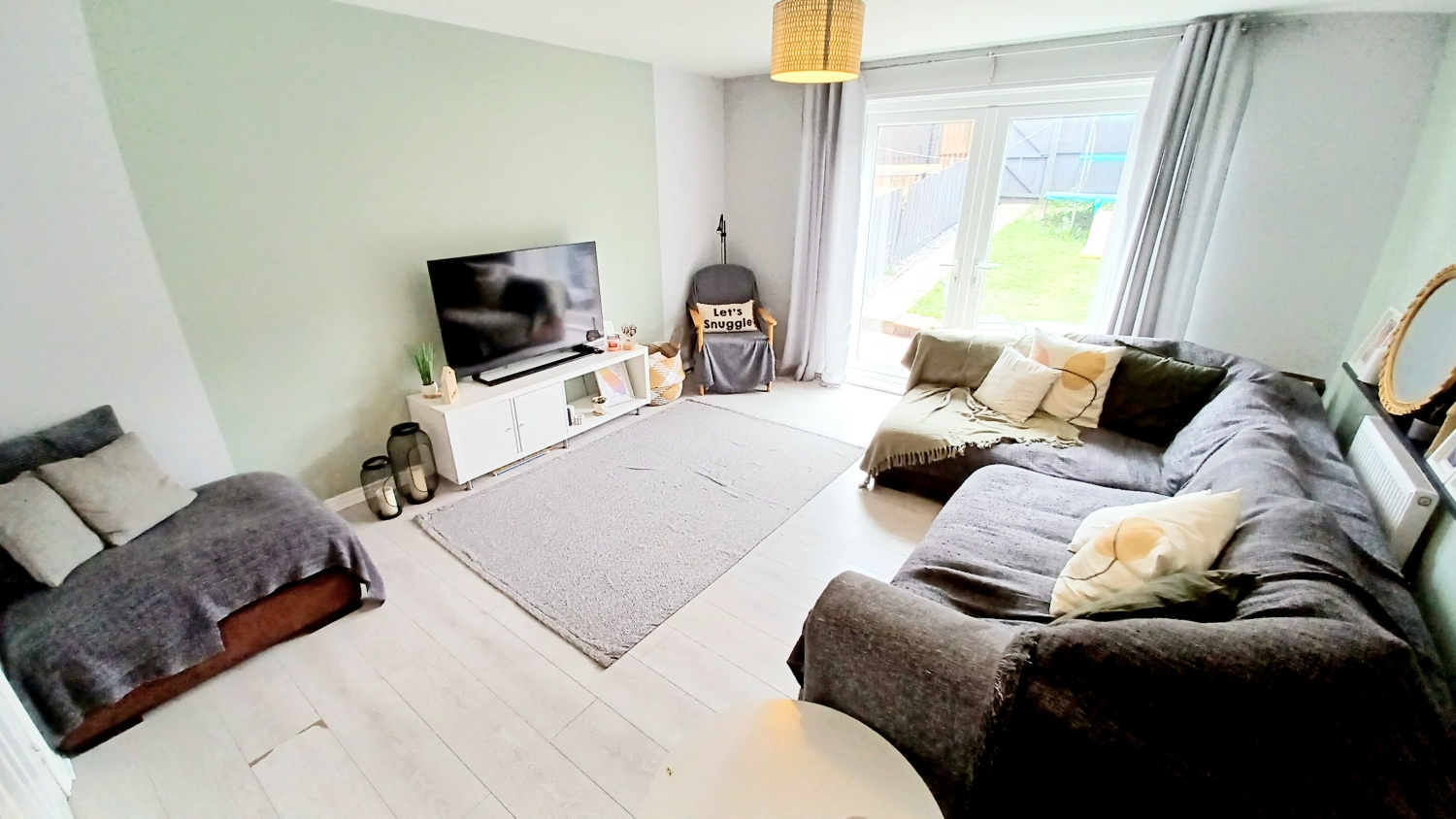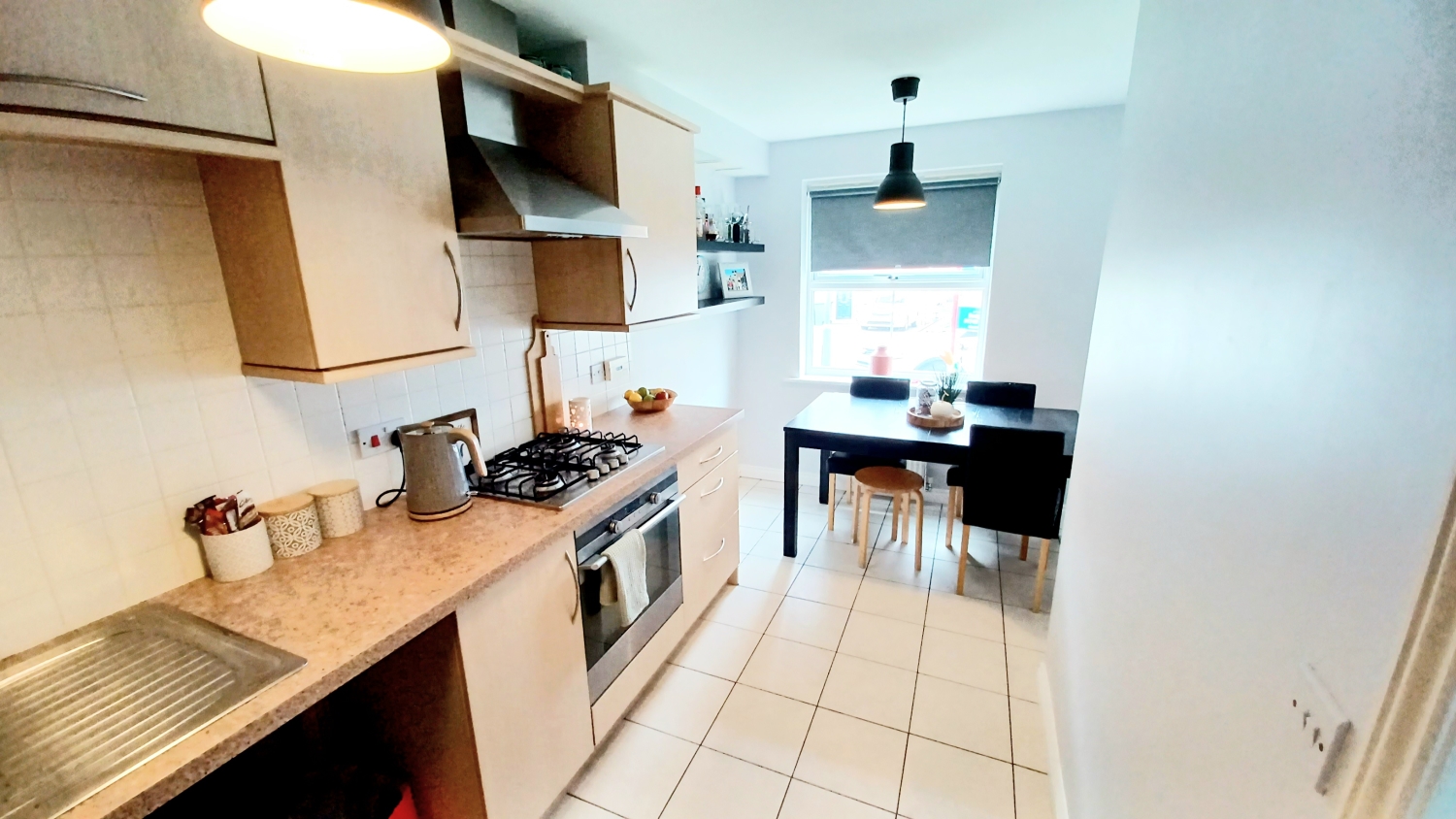 To the ground floor, you'll find a bright and inviting lounge, complete with French doors opening onto the garden, creating an airy connection to the outdoors—ideal for relaxing or entertaining. To the front of the home, the well-appointed kitchen offers plenty of space for cooking, dining or for enjoying your morning coffee.
