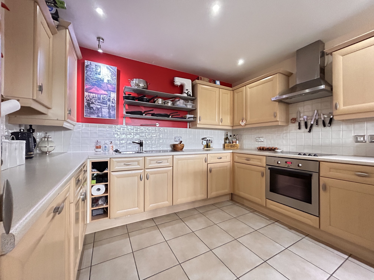 an attractive modern kitchen with ample storage and work top space with built in appliances and breakfast bar.