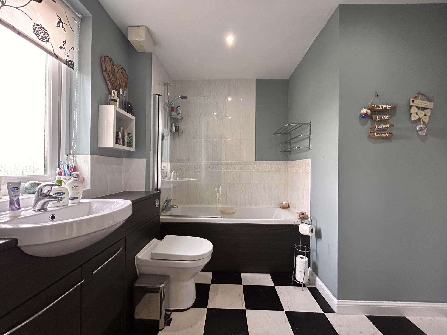 With access to the bedroom and main hallway of this floor this stylish family bathroom is beautifully finished with dark wood panelling to the bath and vanity hand basin brilliantly contrasting with the tile tiling ad flooring creating a convenient and luxurious bathroom