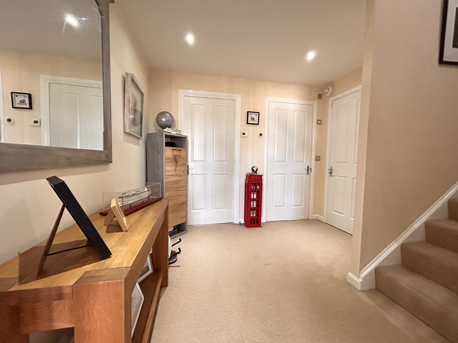a welcoming reception hallway with stairs to upper floor and double doors to lounge.