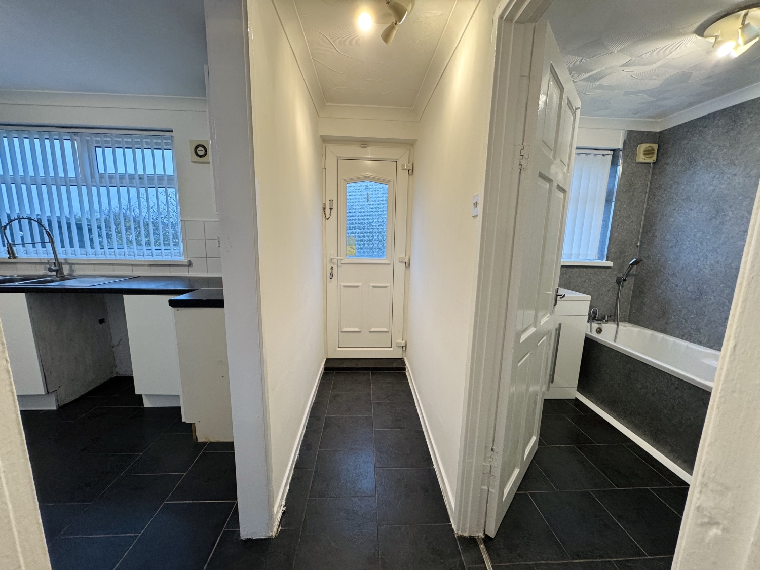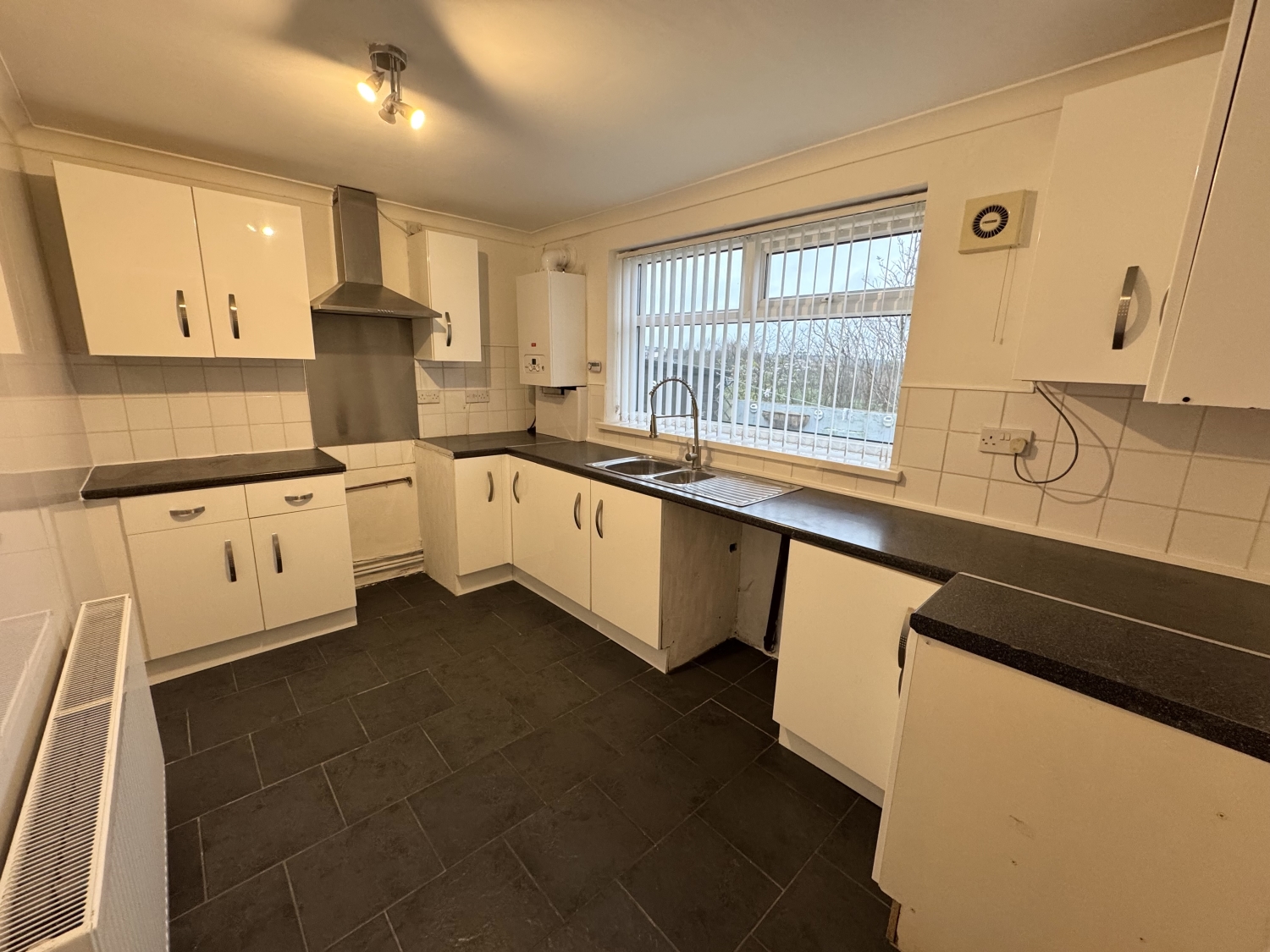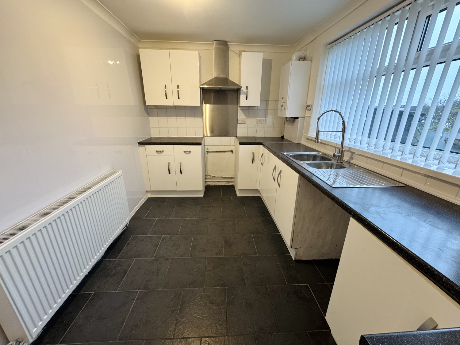 Fitted with a range of wall and base units with complementing work surfaces, space for fridge/freezer, plumbing for washing machine, extractor hood, stainless steel sink with drainer and mixer tap, splash back tiles, tiled flooring, boiler, tiled flooring, radiator, coving to ceiling, double glazed window to the rear elevation