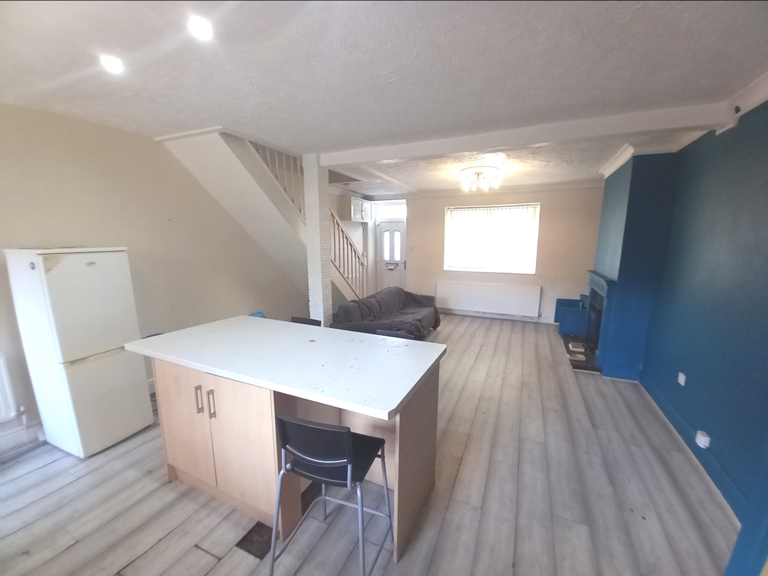 Having a modern range of wall and base units with work surface space, one and a half bowl sink unit with mixer tap, plumbing for washing machine, space for fridge & freezer, electric hob with extractor hood, electric oven, central island with breakfast bar, radiator, laminate flooring, recessed spot lighting, double glazed window to the rear and a door to the shared yard.