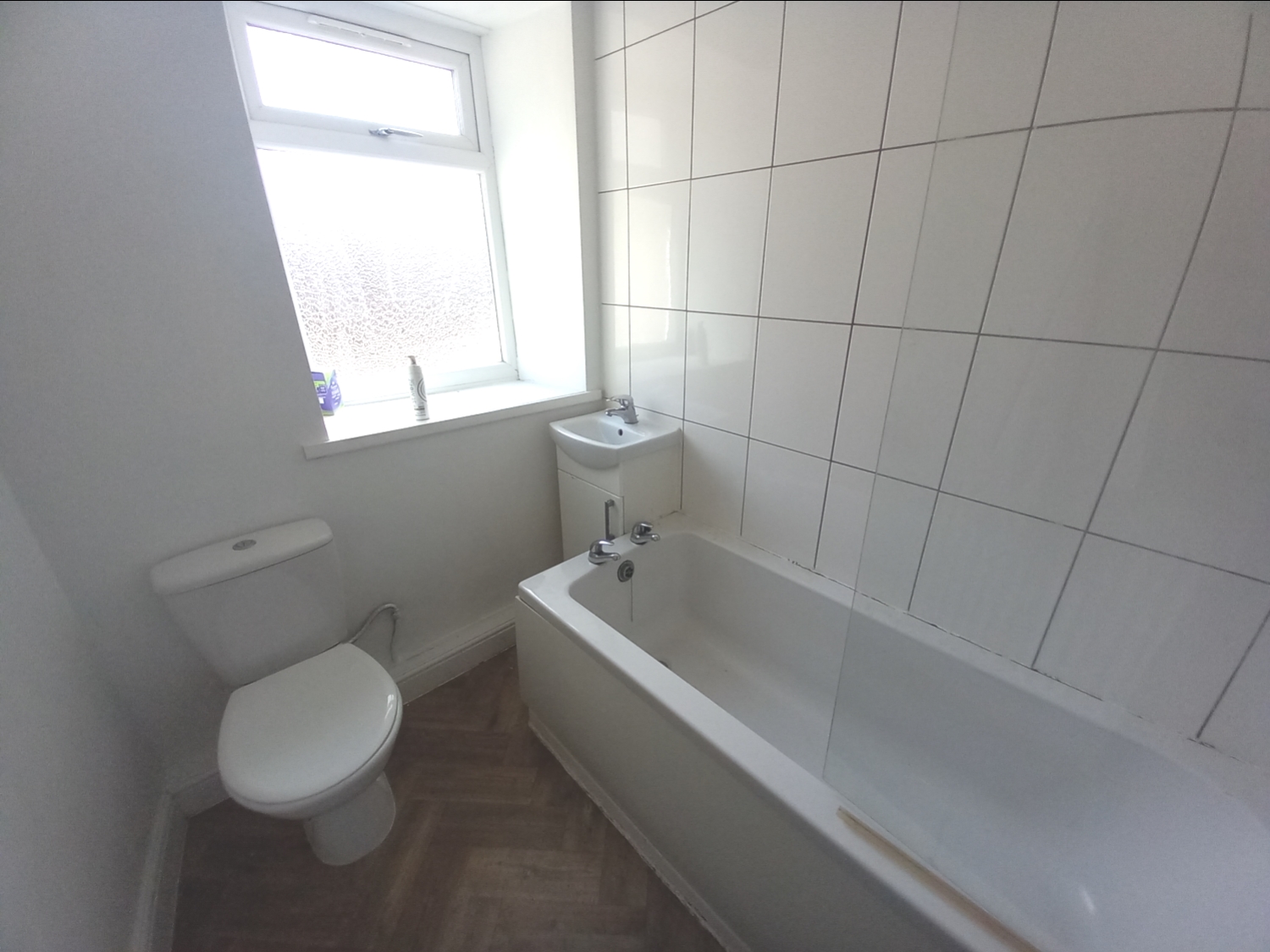 Having a panelled bath with mains fed shower above, wc, pedestal wash basin, tiling, radiator, double glazed window to the rear.