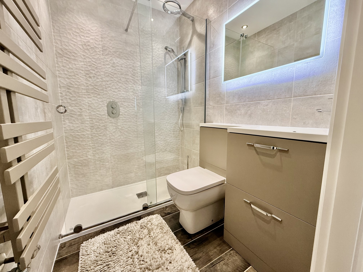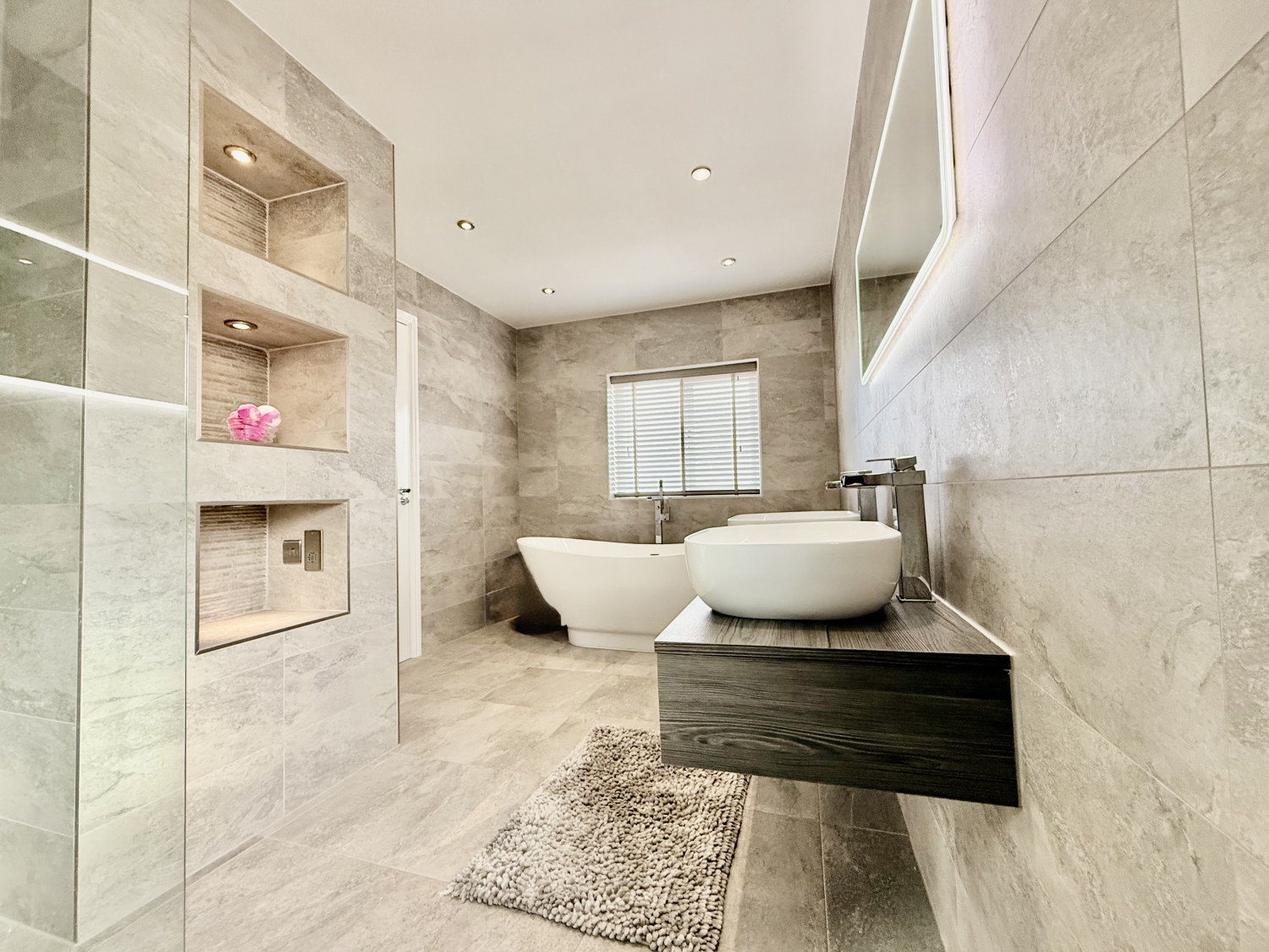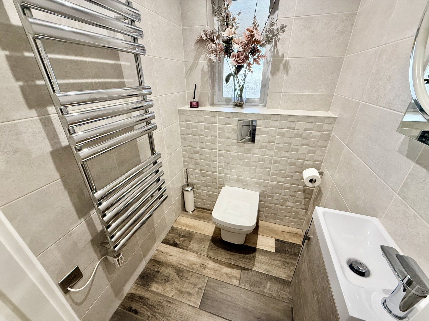 The four refitted WC and bathroom spaces have also been completed to a superb specification, incorporating modern fixtures and stylish finishes. Throughout the home, the décor is tasteful, contemporary and immaculately presented, complemented by high‑quality porcelain tiling across the downstairs living areas and extending seamlessly into the rear garden.