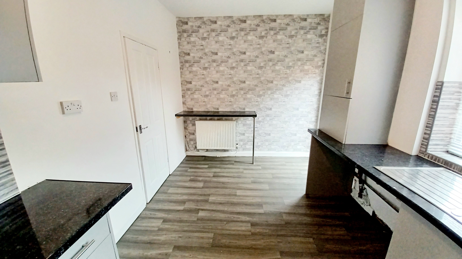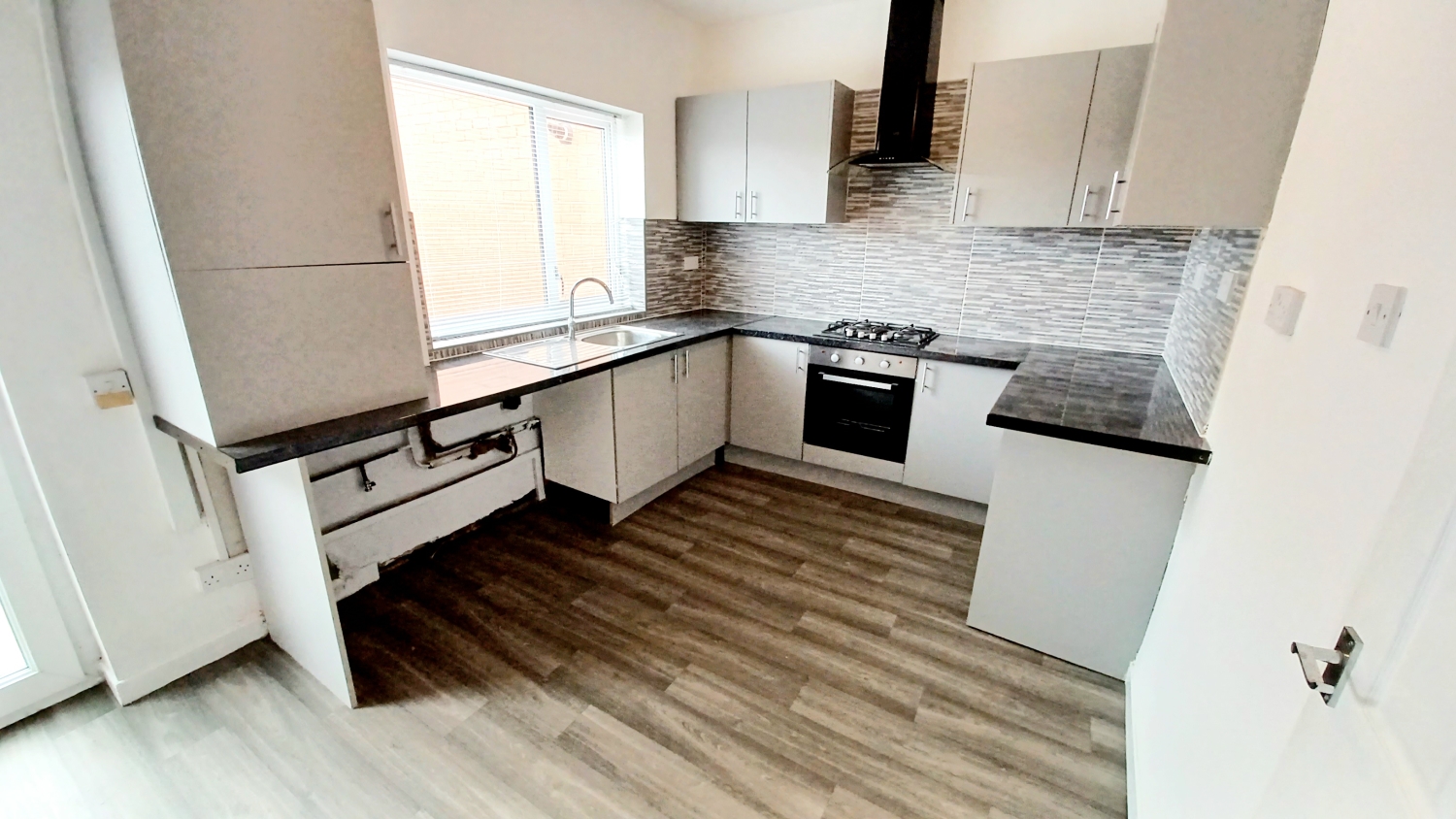 Fitted with an excellent range of modern base and wall units finished in grey, heat resistant worktops, stainless steel sink unit with mixer tap, integrated oven with hob and extractor, plumbing for automatic washing machine, tiling to splashbacks, upvc framed double glazed window, radiator, lino flooring, space for fridge freezer, door accessing the rear of the property, breakfast bar area.