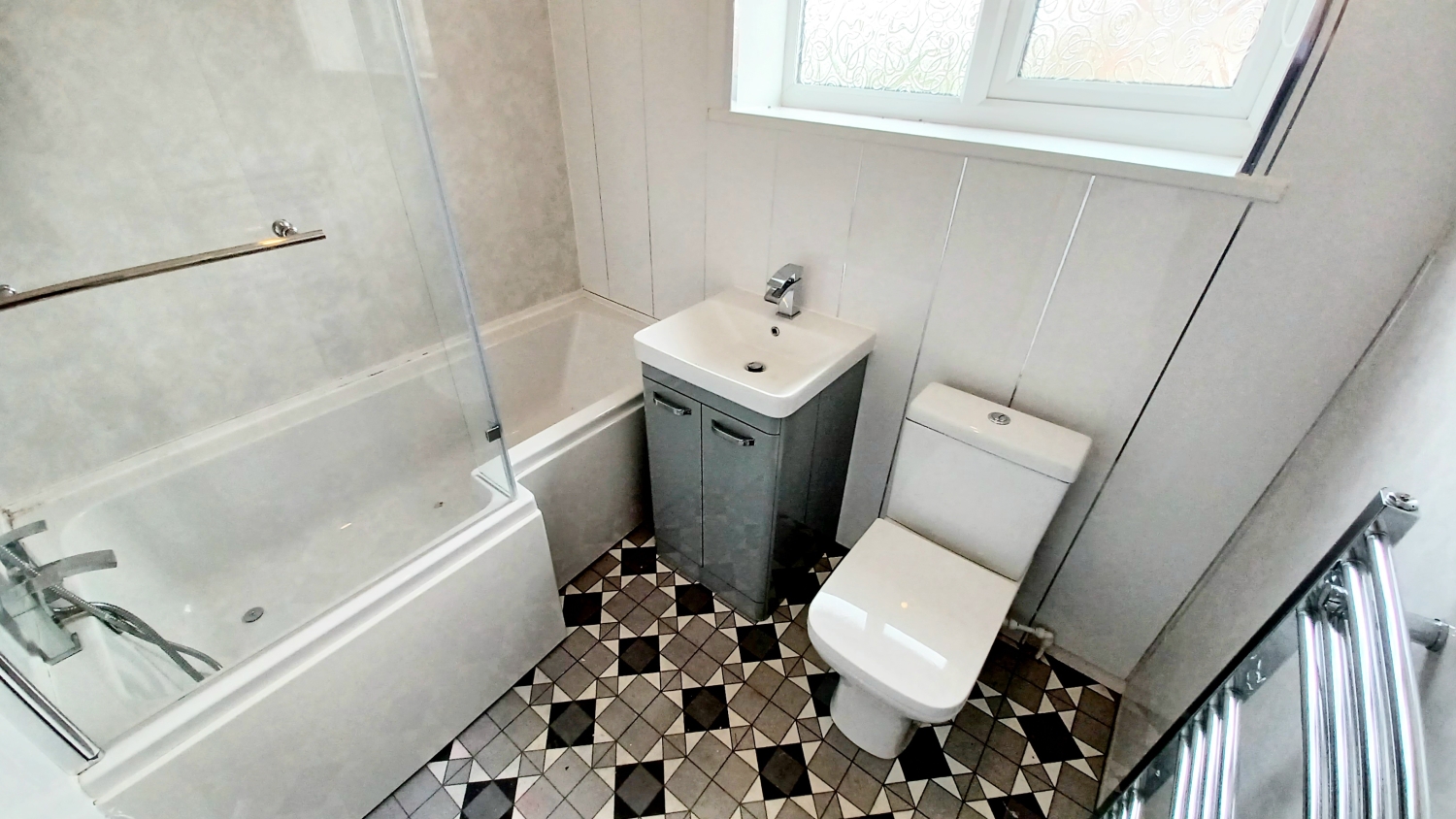 Fitted with a well appointed 3 piece suite comprising a panel bath with overhead shower and screen, handwash basin inset into vanity unit, low level WC, cladding to the walls, heated towel rail, double glazed window, lino flooring, extractor.